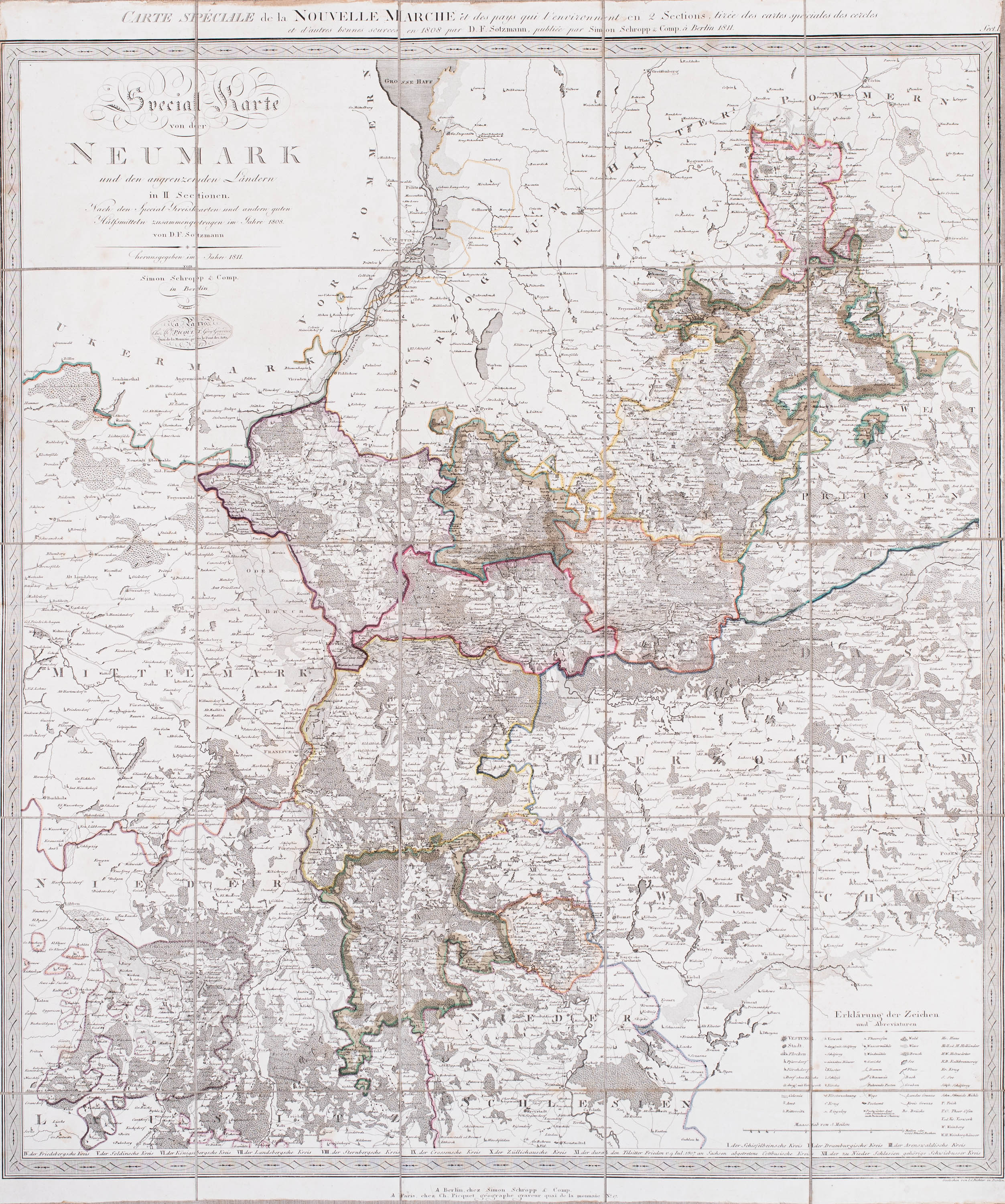 Mapa Nowej Marchii według Daniela Friedricha Sotzmanna, wyd. Simon Schropp & Co., Berlin, 1811 miedzioryt kolorowany liniowo w epoce, papier naklejony na płótno, wym. mapy 86 × 72 cm stan zachowania bardzo dobry rzadkie