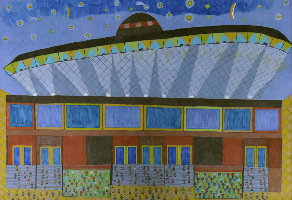 Na odwrocie drukowana nalepka Warsztatu Terapii Zajęciowej Unikat, Katowice z tekstem ołówkiem: tytuł „Spodek nocą” / autor Paweł Garncorz, 2007 / instruktor Piotr Zatorski, oraz nalepka Galerii Szyb Wilson.