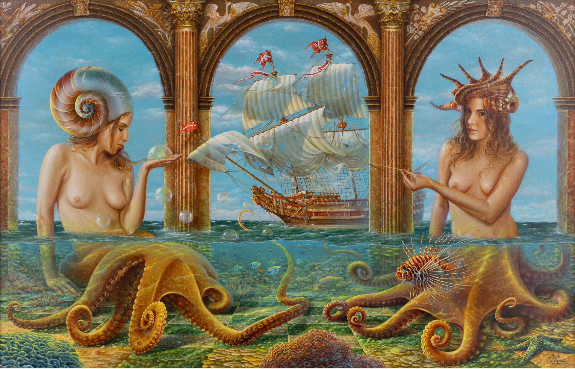 olej, płyta, 81 x 135 cm (w oprawie 102 x 145 cm),sygnowany p.d.: '2020 | [monogram A] | Arkadiusz | Dzielawski' oraz opisany na odwrocie: '2020 | Arkadiusz | Dzielawski | "Spotkanie na krańcu świata"'