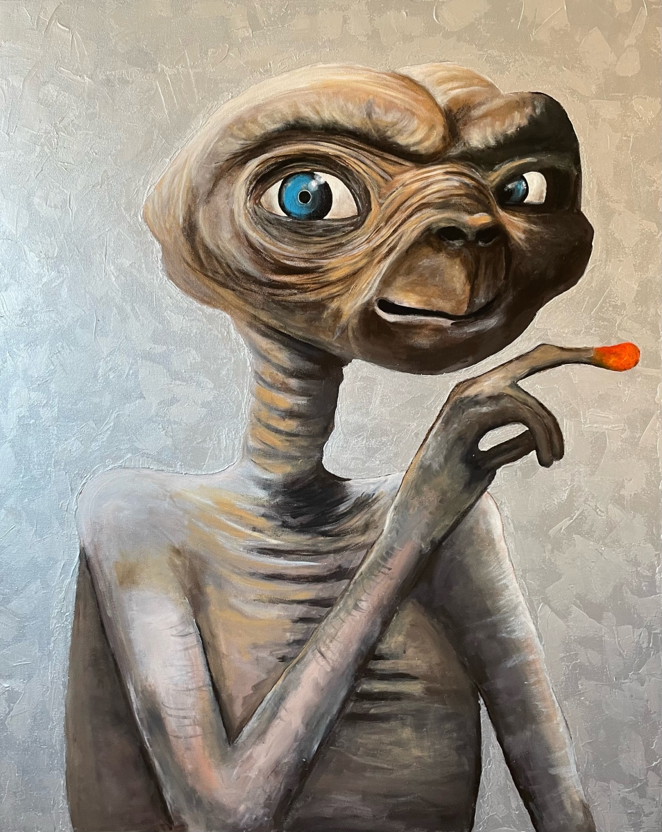 akryl, płótno, 100 x 80 cm,sygn. p.d.: znak graficzny K@rt oraz na odwrocie.Obraz inspirowany filmem „E.T.” w reżyserii Stevena Spielberga z 1982 roku.