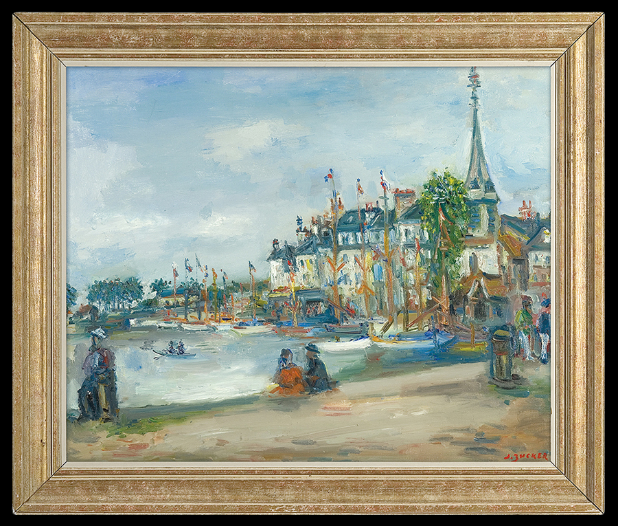 Honfleur w Normandii to stary port u ujścia Sekwany, który w XIX wieku stało się ulubionym miasteczkiem malarzy. Tu urodził się, tworzył i ma swoje muzeum Eugene Boudin, tu przyjeżdżali malować Gustave Courbet, Claude Monet, Johan Jonkind, Albert Sisley, Józef Pankiewicz i wielu innych artystów. Zresztą przyjeżdżają nadal; malują port, łodzie, stare domy, placyki, kościoły. Bywał w Honfleur i Jakub Zucker; prezentowany tu jego obraz przedstawia nabrzeże starego basenu portowego z otaczającymi go domami i górującą nad nimi wieżą kościoła Saint-Etienne.