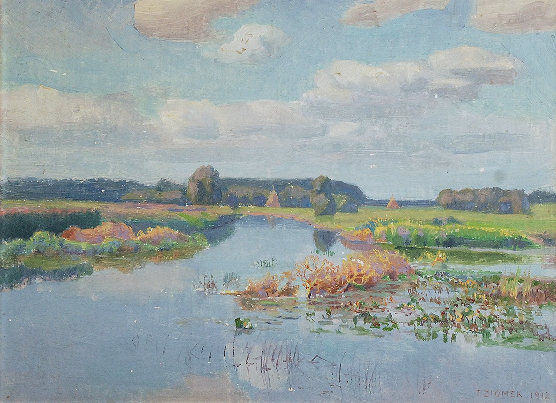 olej, tektura; 26,5 x 36 cm;sygn. i dat. p. d.: T. ZIOMEK 1912;na odwrocie napis: Staw oraz nr 84 (ołówkiem); obraz przed konserwacją.