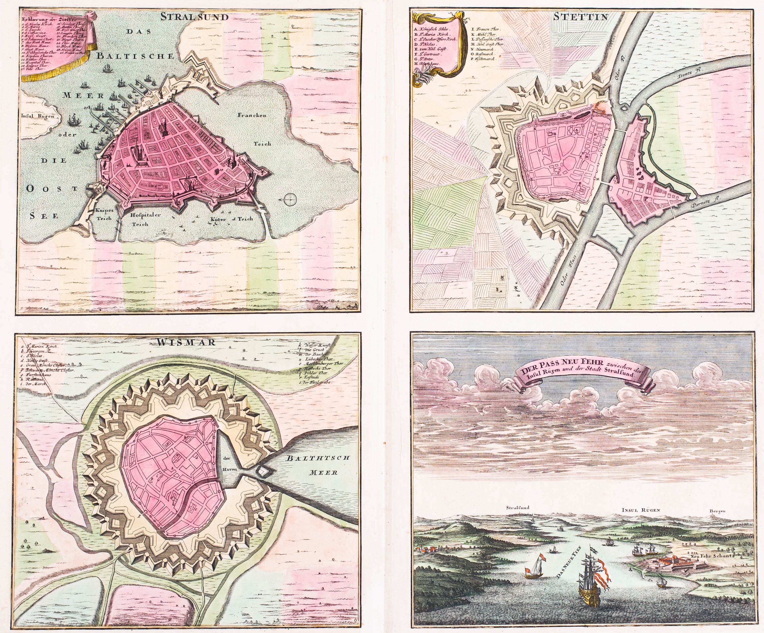 Szczecin, plan fortyfikacji i widok miasta z lotu ptaka, Norymberga, ok. 1720miedzioryt kolorowany w epoce, 49 x 58,5 cm (odcisk płyty)stan zachowania bardzo dobry