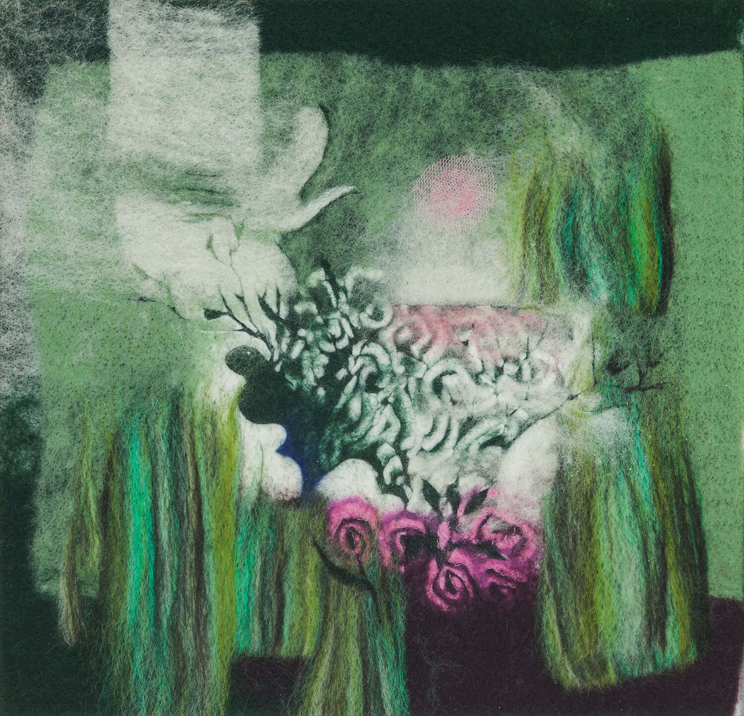 obraz włókienniczy, kolaż tkanin, 26,8 x 26,8 cm (w świetle passe-partout). Oprawiony, passepartout, rama aluminiowa ok. 45,5 x 43,2 cm.