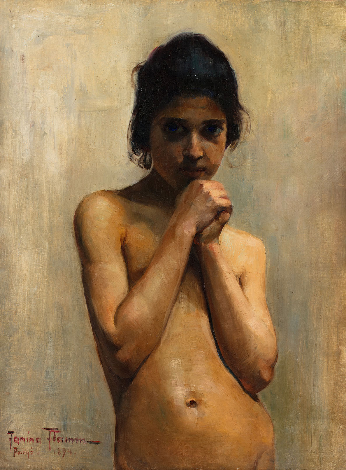 Oferowane studium, namalowane przez Janinę Flamm w pierwszym roku pobytu artystki w Paryżu, przynależy do akademickiej fazy w jej twórczości. Zdradza doskonale opanowany warsztat, efekt gruntownego wykształcenia w zakresie malarstwa portretowego odebranego jeszcze przed wyjazdem do Académie Julian. Wejście w nowoczesne środowisko tej paryskiej szkoły, która nie tylko jako pierwsza w latach 80. XIX wieku pozwoliła kobietom malować akty z modela ale gromadziła twórców z wielu krajów europejskich i obydwu Ameryk, dało młodej Janinie Flamm nowe możliwości wyrazu. Jej malarstwo z okresu nauki w Académie Julian łączy akademickie wykształcenie z modernistyczną wrażliwością. Cechuje je doskonałe opanowanie tradycyjnych technik, szczególnie w przedstawianiu ciała, a jednocześnie eksploruje emocjonalną głębię poprzez intymne, często introspektywne tematy. Paleta barw skłania się ku ciepłym, ekspresyjnym tonom, a nacisk kładziony jest na nastrój, charakter i psychologiczny aspekt portretowanych modeli. Jej pociągnięcia pędzlem wahają się od precyzyjnych po luźno teksturowane, ukazując przejście od akademickiego realizmu do bardziej malarskiego, ekspresyjnego podejścia. Analizy porównawcze pozwalają dostrzec w oferowanym studium istotny wpływ jaki na twórczość Janiny Flamm miało malarstwo Amélie Beaury-Saurel, francuskiej artystki a zarazem nauczycielki w Académie Julian.