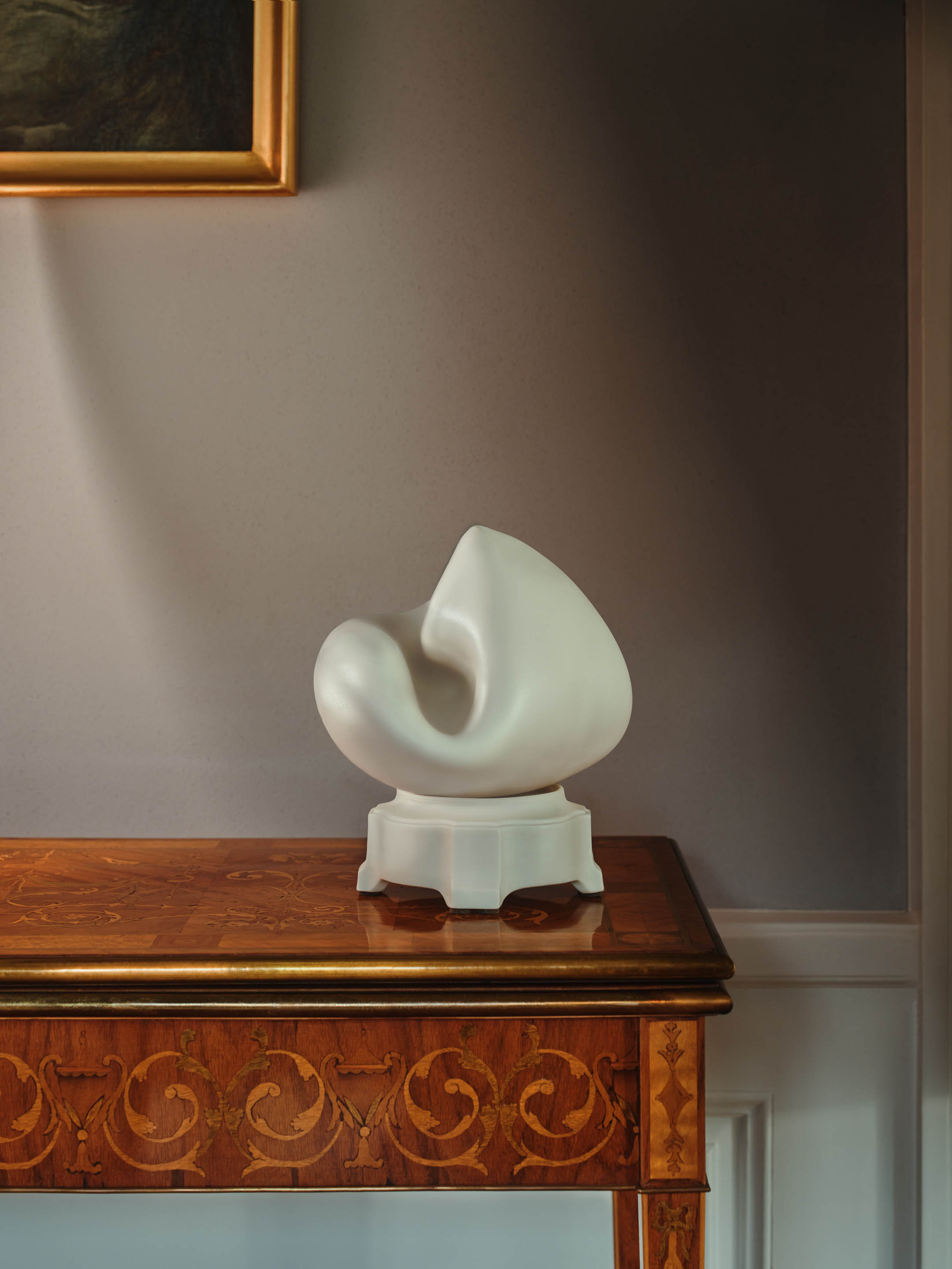 Forma lampy CLOUD jest tak mocna, idealna i nietykalna w swojej wewnętrznej równowadze, że jakakolwiek powierzchowna ingerencja wydawała mi się tylko próbą odebrania jej tej niewzruszonej boskości. Zamiast tego postanowiłam wejść głębiej, poszukać jej wewnętrznych napięć i pozwolić formie opowiedzieć coś o sobie samej. CLOUD została odlana z porcelany i poddana swobodnej deformacji podczas wypału na ostro. Ten gest rezygnacji z kontroli (a jednocześnie gest przejęcia) jest dla mnie kluczowy: to moment, w którym forma zaczyna mówić własnym głosem.