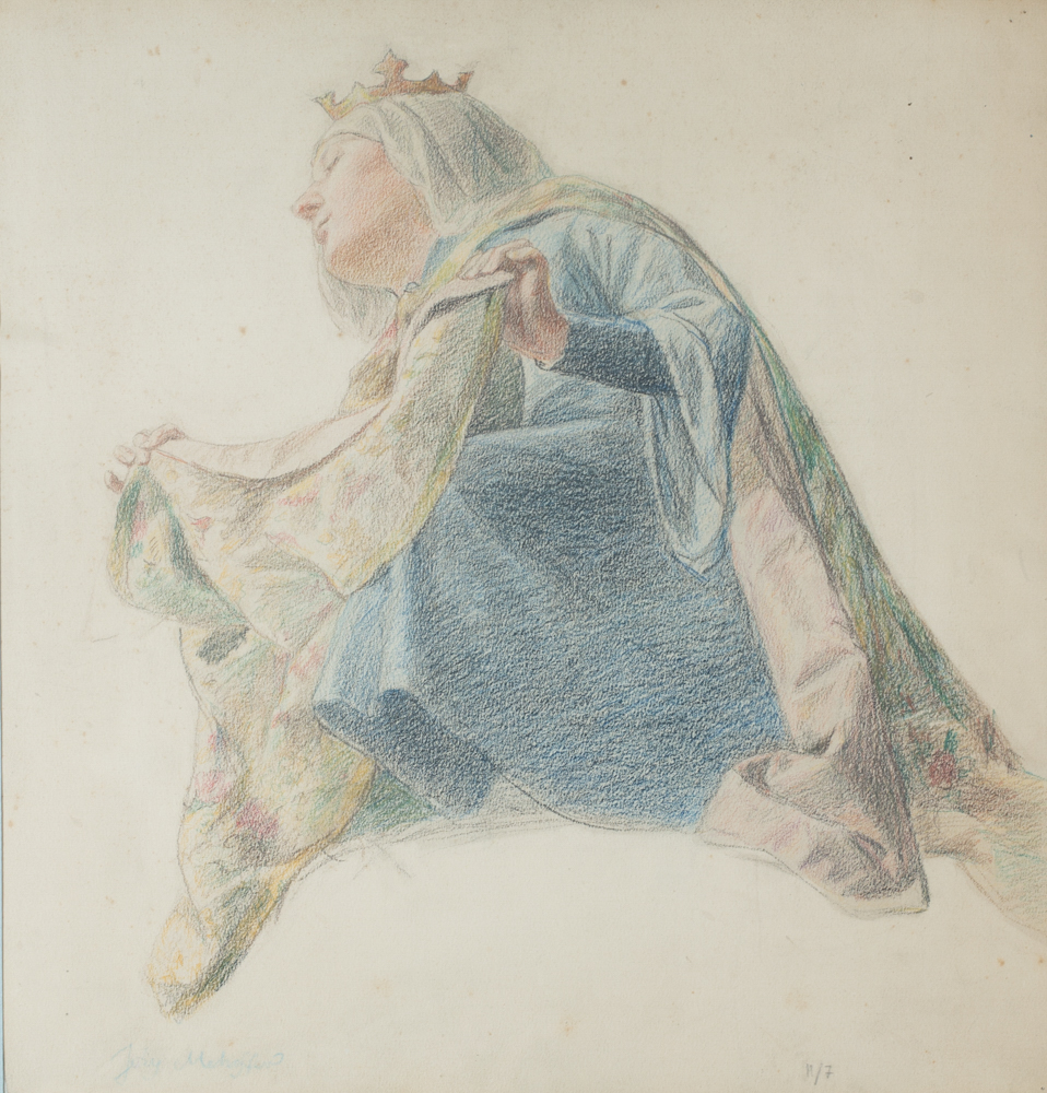 Prezentowane dzieło to studium kobiecej postaci w typie królewskim, przypuszczalnie przedstawiające św. Elżbietę Węgierską. Mehoffer wykonał również witraże do kościoła pw. św. Elżbiety w Jutrosinie przedstawiające tę samą postać z ikonografii chrześcijańskiej (il. I). „Kartony jutrosińskie zostały z entuzjazmem przyjęte przez Zdzisława Czartoryskiego, który jednoznacznie pisał w liście do artysty, iż „całość kartonów jest po prostu śliczna i przeszła nasze oczekiwania […] Witraż przedstawia św. Elżbietę z Turyngii zwaną też Węgierską […]. Zgodnie z dawną tradycją ikonograficzną św. Elżbieta ukazana jest w chwili ofiarowywania żebrakowi jałmużny”. („Józef Mehoffer. Opus Magnum”, katalog wystawy, Muzeum Narodowe w Krakowie, 28 I 2000 – 24 IV 2000, red. Jerzy Żmudziński, Kraków 2000, s. 205–206). Nie jest jednak potwierdzonym, by prezentowane studium było jednoznacznie powiązane z jutrosińskim projektem. Kolejny przykład powielenia wizerunku św. Elżbiety Węgierskiej to rysunek wykonany węglem i piórem, który wzmiankowany jest w publikacji warszawskiego Towarzystwa Zachęty Sztuk Pięknych z 1935 roku. Bez wątpienia można stwierdzić, że prezentowane „Studium postaci królowej” i dzieła powstałe na potrzeby dekoracji kościoła w Jutrosinie charakteryzuje wysoka jakość artystyczna.