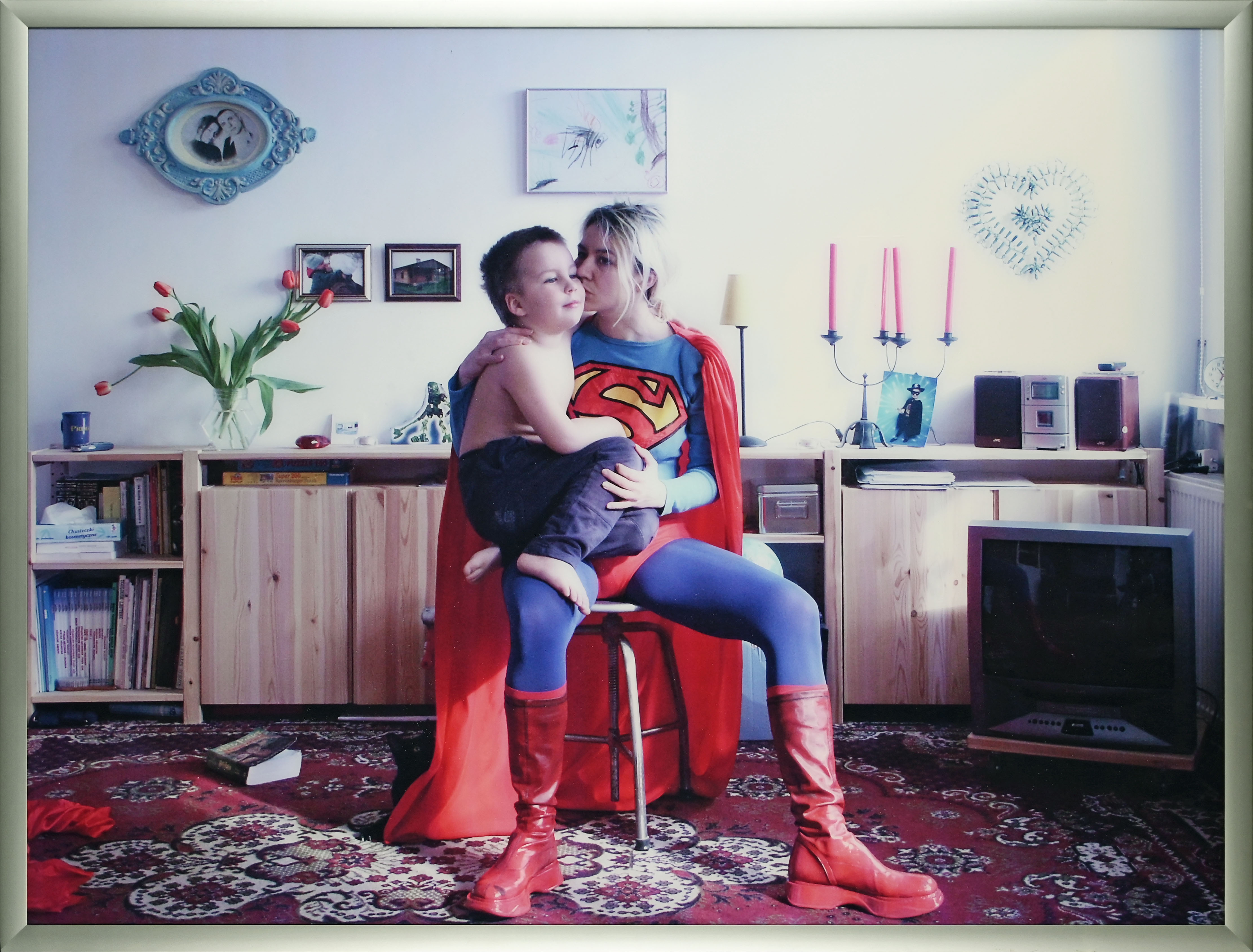 Supermatka to cykl autoportretów, w którym artystka pojawia się w kostiumach ulubionych superbohaterów swojego syna Antka – Batmana, Spidermana i Supermana – osadzonych kolejno w kuchni, przedpokoju i pokoju rodzinnego mieszkania. Praca była prezentowana jako przestrzenna instalacja, składająca się z wielkoformatowych wydruków ustawionych w formie „placu zabaw” lub świetlicy dla dzieci, łącząc intymny, domowy świat z przestrzenią interaktywną.