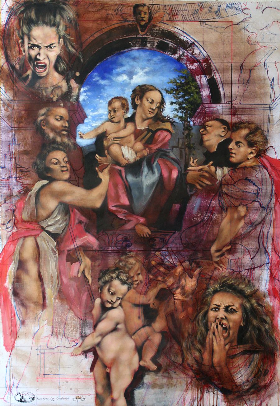 techn. mieszana; płótno naklejone na płytę,130 x 90 cm, werniks błyszczącysygnowany l. d. róg: "Adam Nowacki'22 |Supplement | 1227/04/22'