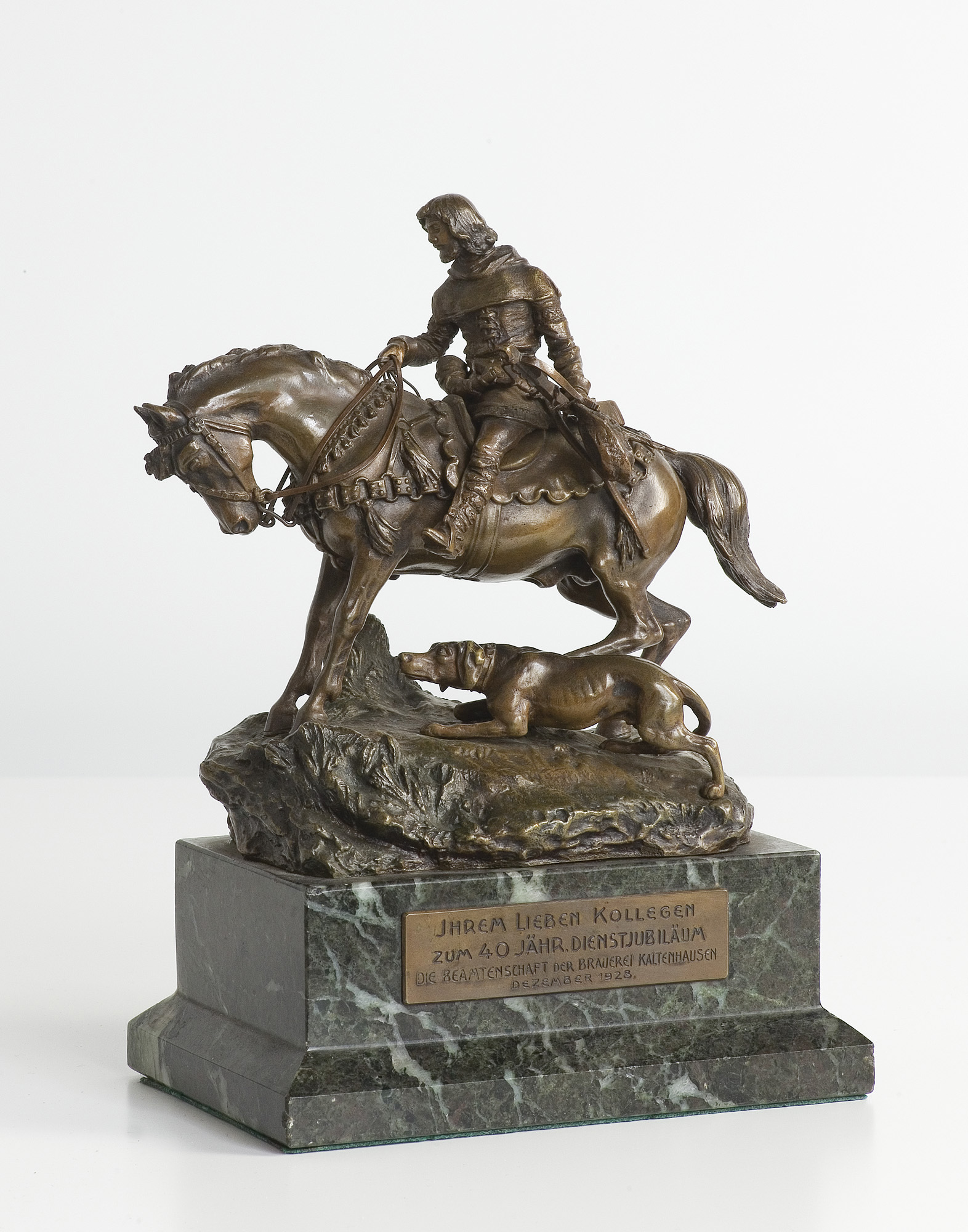 brąz odlewany, cyzelowany, patynowany, podstawa – marmur sygn. na podstawie: C. Kauba. wys. 20,5 cm Na podstawie tabliczka: JHREM LIEBEN KOLLEGEN | ZUM 40 JÄHR. DIENSTJUBILÄUM | DIE BEAMTENSCHAFT DER BRAUEREI KALTENHAUSEN | DEZEMBER 1928