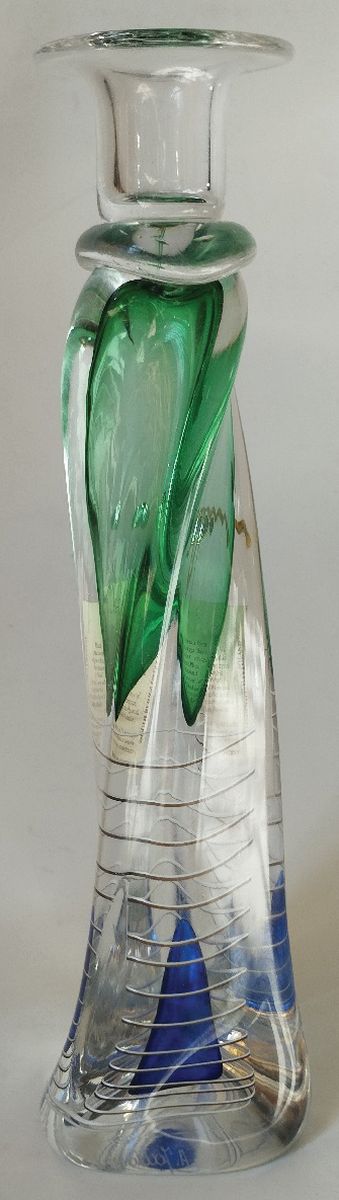 Szkło bezbarwne, wtopione kobaltowe, zielone i nić szklana, wys. 32 cmSygnowany: A. Jabłoński, nalepka firmowa