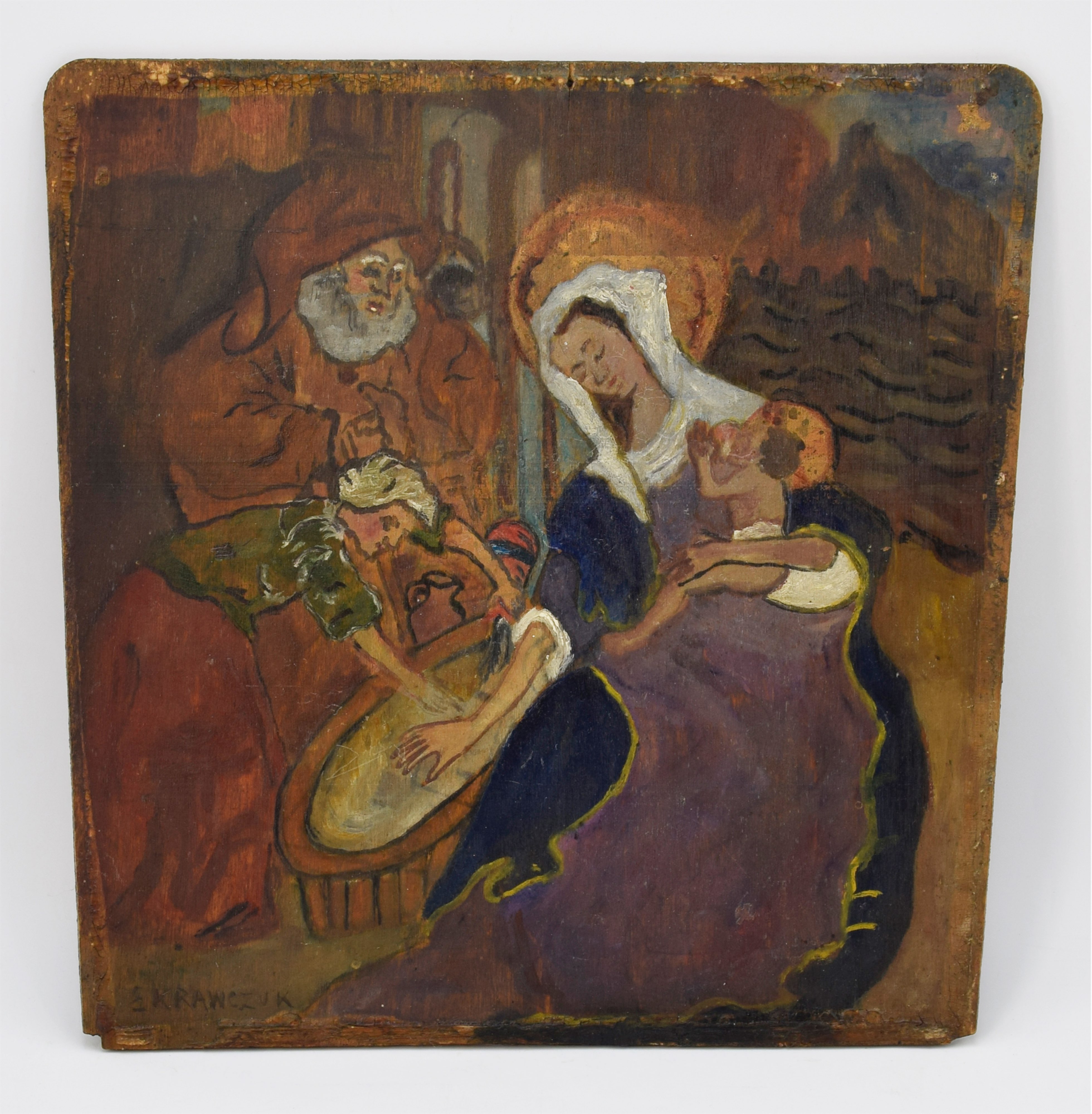 olej, złota farba, sklejka; 35,5 x 36 cm;