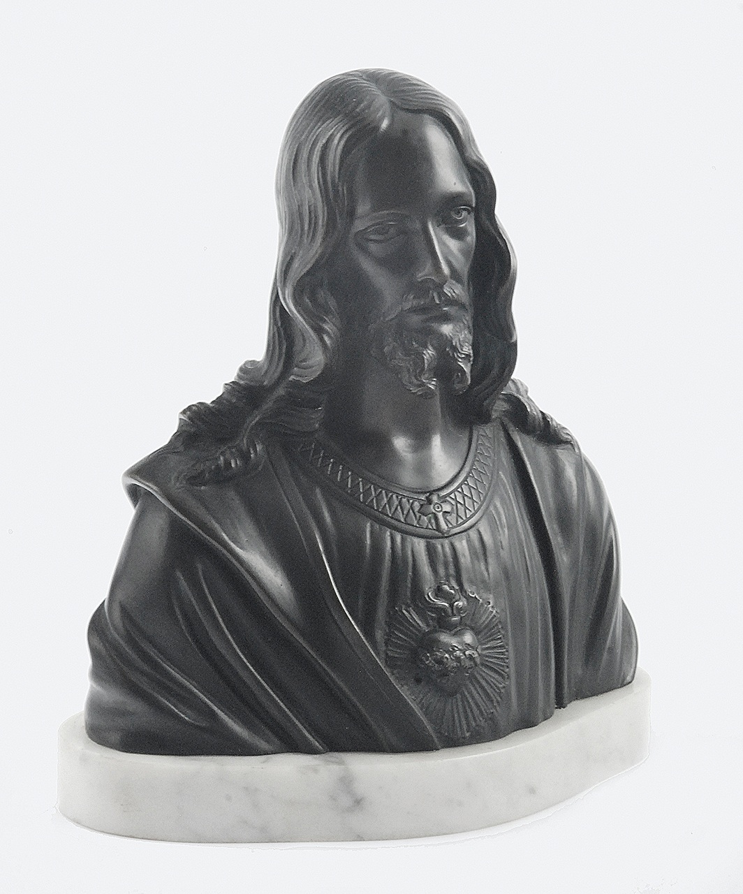 Popiersie Chrystusa z twarzą okoloną zarostem i długimi włosami spływającymi na ramiona, odzianego w fałdziste szaty. Na piersiach - gorejące serce opasane cierniową koroną, na tle promieni.