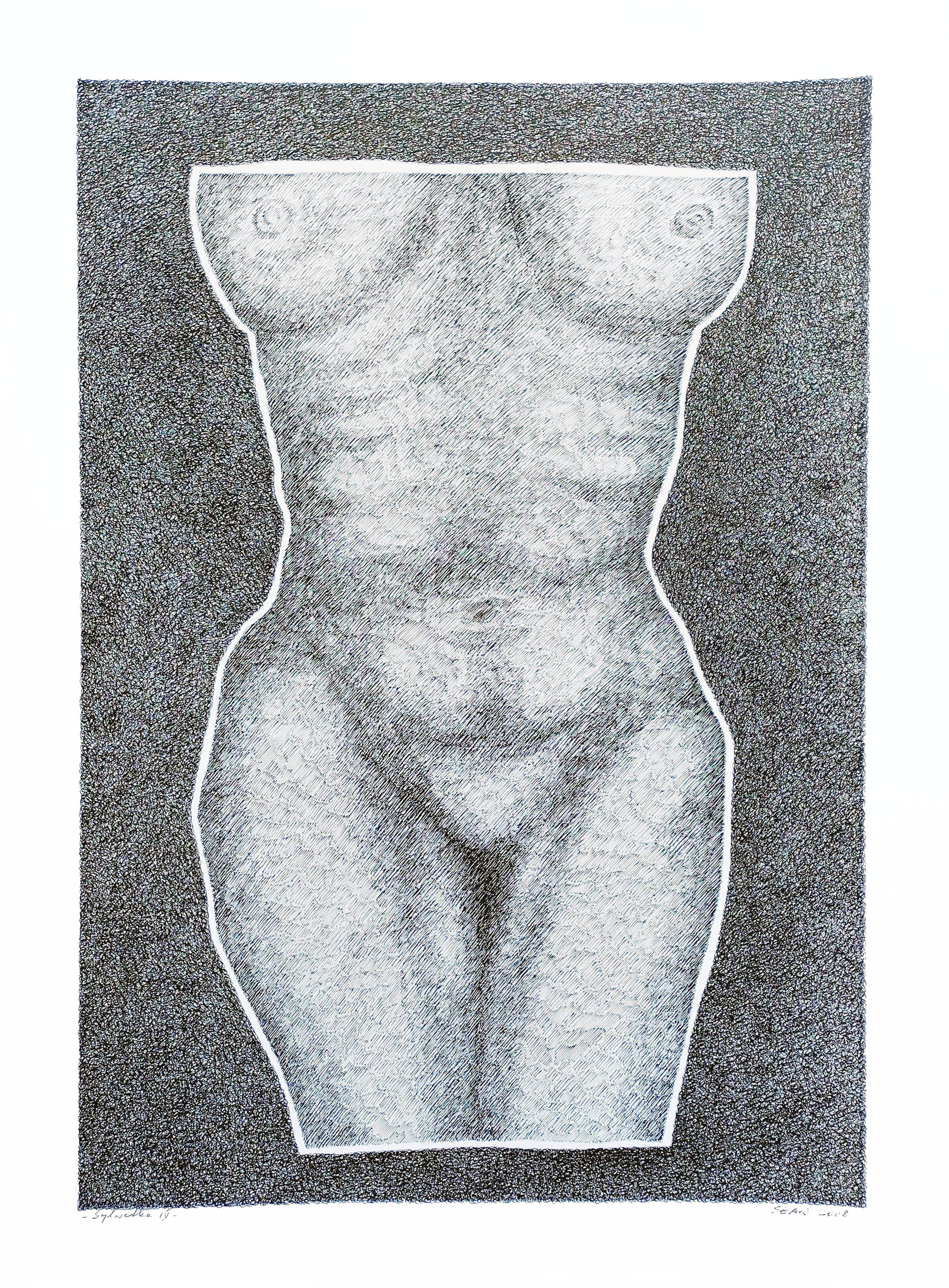 tusz, cienkopis na papierze, 50 cm × 70 cm (kompozycja), 60 cm x 80 cm (arkusz); sygnowany i datowany odręcznie, pod kompozycją (ołówkiem), u dołu po lewej: - Sylwetka IV - ; u dołu po prawej: Sław / 2008