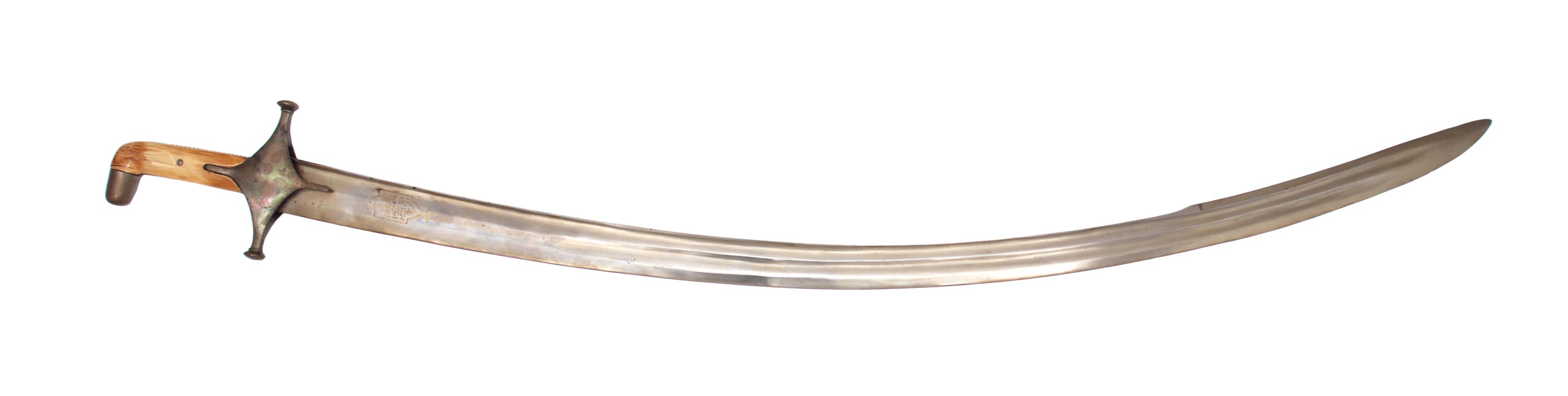 Rękojeść otwarta, głowica odchylona pod katem prostym, zakończona naparstkiem. Okładziny rękojeści z polerowanej kości, zanitowane wraz z trzpieniem jednym nitem i obwiedzione ozdobną, mosiężną taśmą. Jelec krzyżowy, stalowy, z wąsami i ramionami zakończonymi ozdobnymi guzami. G ł o w n i a starsza, stalowa, polerowana, z płaskim grzbietem. Obustronnie profilowana w dwie bruzdy, szerokie, obosieczne pióro z młotkiem, sztych przygrzbietowy. Na zewnętrznym płazie, na wysokości zastawy, trawiona dekoracja z inskrypcją w języku arabskim.