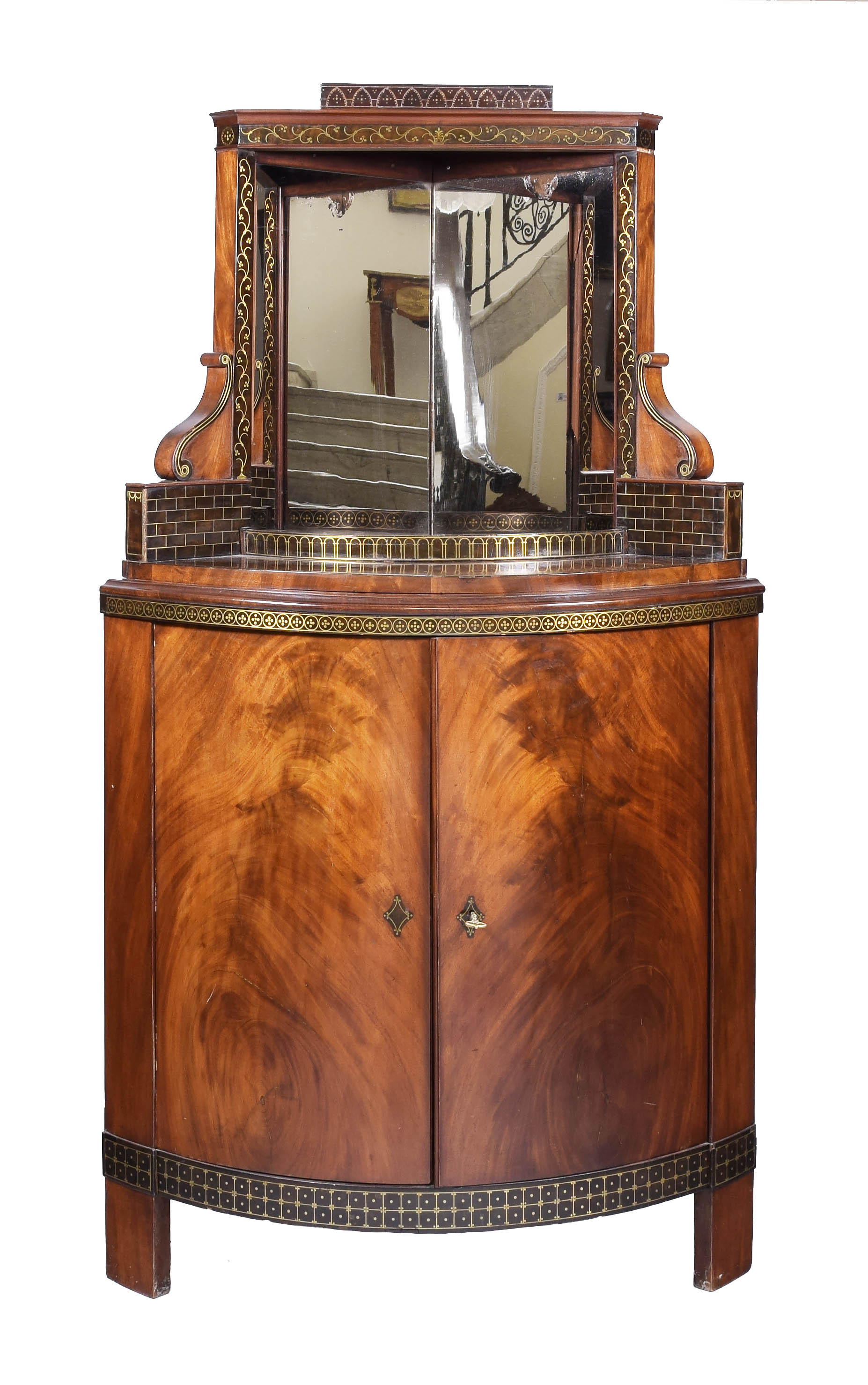 mahoń, dębina, buczyna, brzoza barwiona na orzech, żyłka mosiężna, mosiądz złocony, tafla lustrzana; 164,2 x 91 x 62 cm.