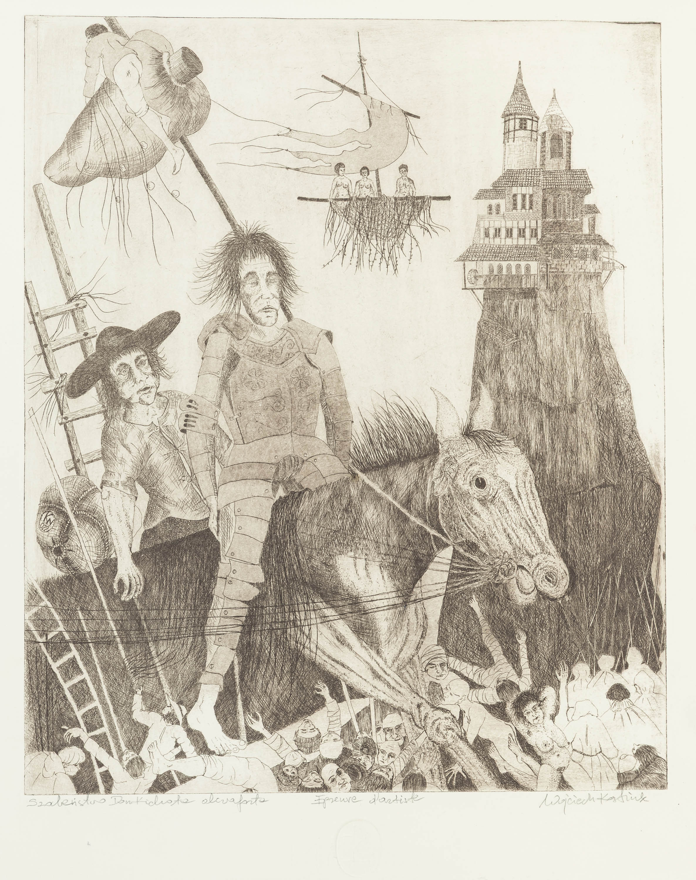 akwaforta, papier, 35 x 43 cm w świetle passe-partout,sygn. p.d.: Wojciech Kostiuk, opisany l.d.: Szaleństwo Don Kichota