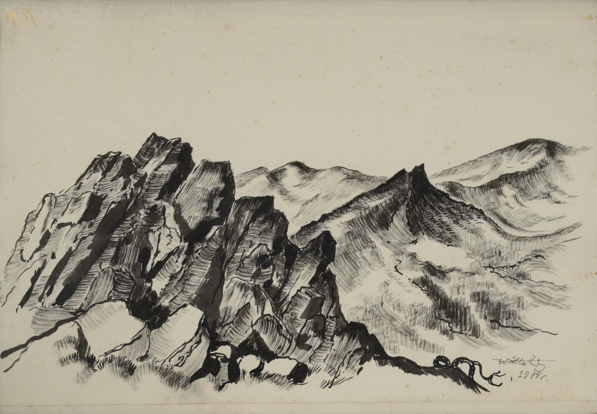 tusz, papier naklejony na karton20 x 31,3 cm (praca); 22 x 31,5 cm (w świetle); 29 x 39 cm (z oprawą)Sygn. i dat. p.d.: "Wiktor Zin | 1978 r"