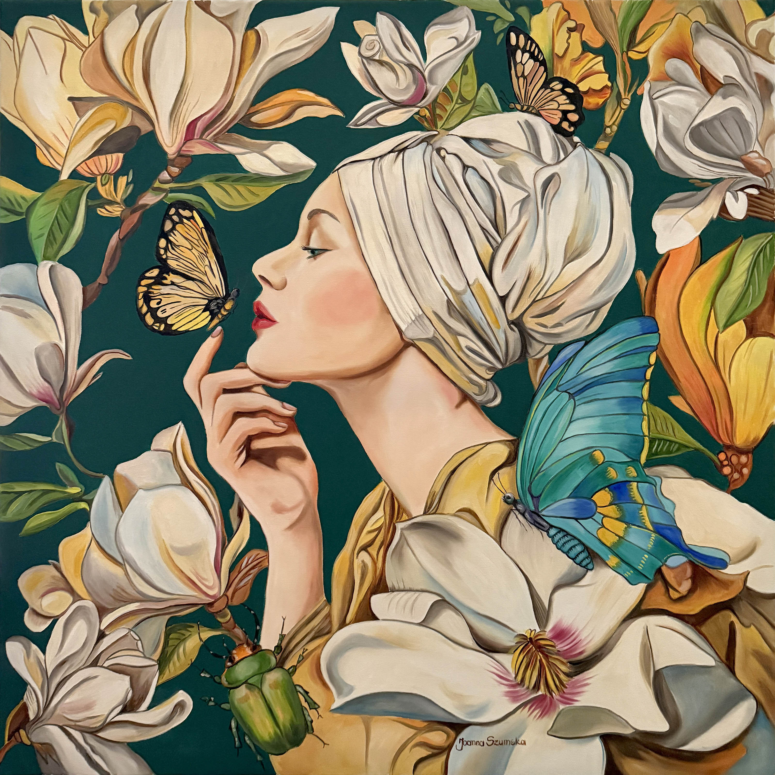 olej, płótno, 80 x 80 cm,sygnowany p.d. oraz opisany na odwrocie: 'Joanna Szumska Szepty w szmaragdowym ogrodzie'