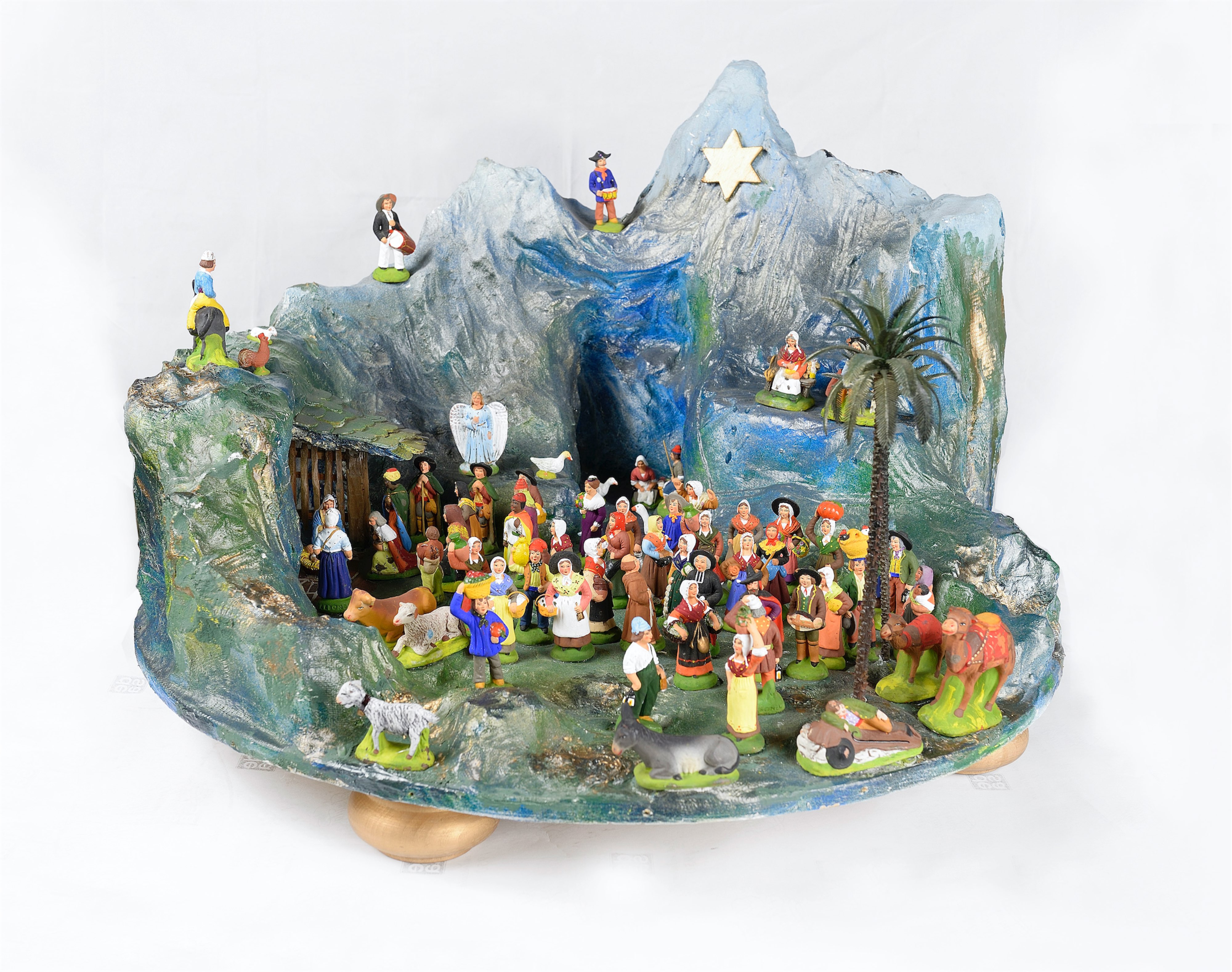 Figurki z gliny malowana ręcznie na podstawie, żarówki wys. 45 cm, średnica ok. 66 cm. Marsylia, II poł. XX w.