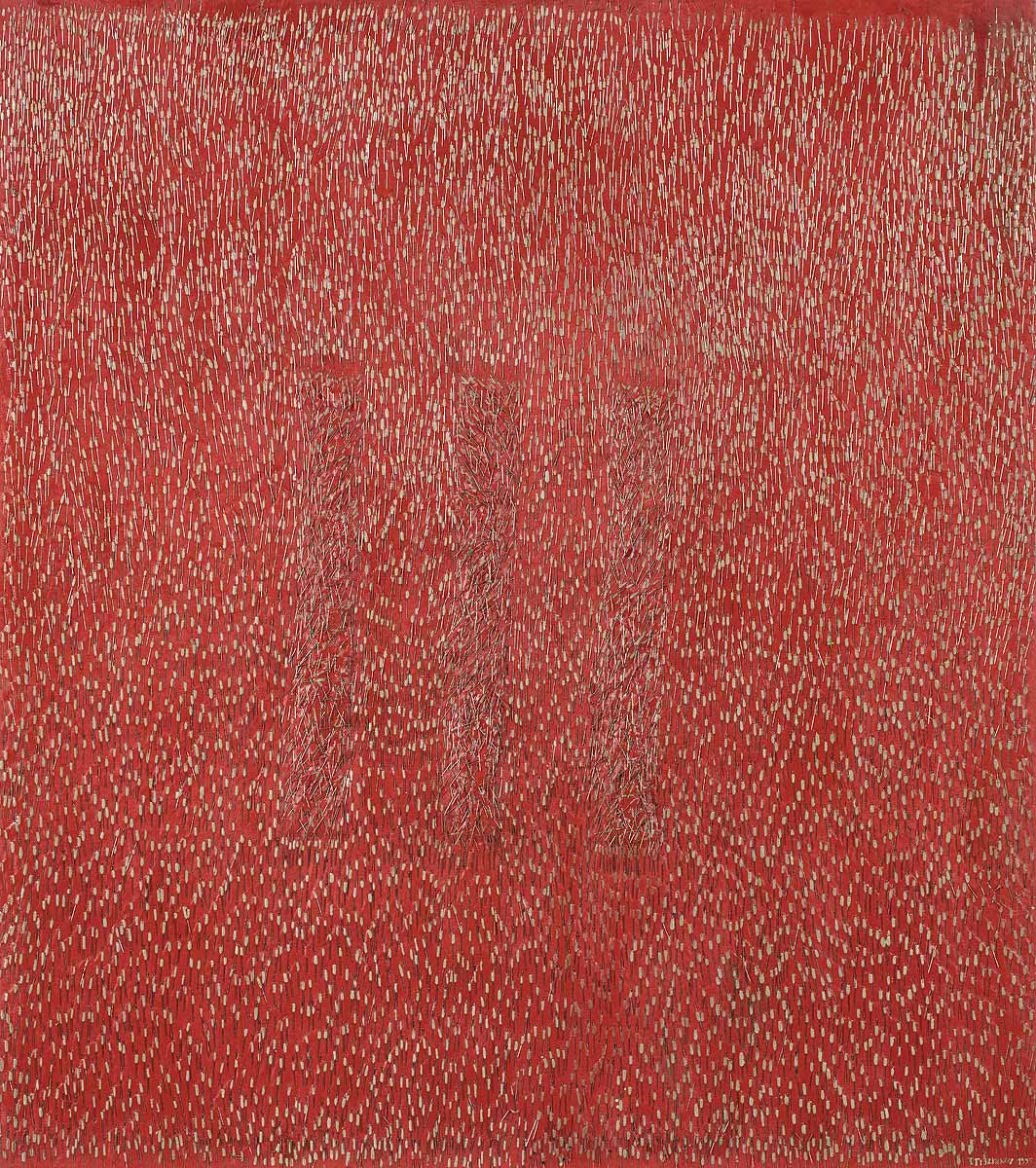 szpilki, akryl, płótno133 x 117,5 cm sygn. p.d.: T. TYSZKIEWICZ 1995, sygn. i opisany na odwrociu: Teresa / TYSZKIEWICZ / "Rouge épingle" / 1995, nalepka z Galerie Anne de Villepoix