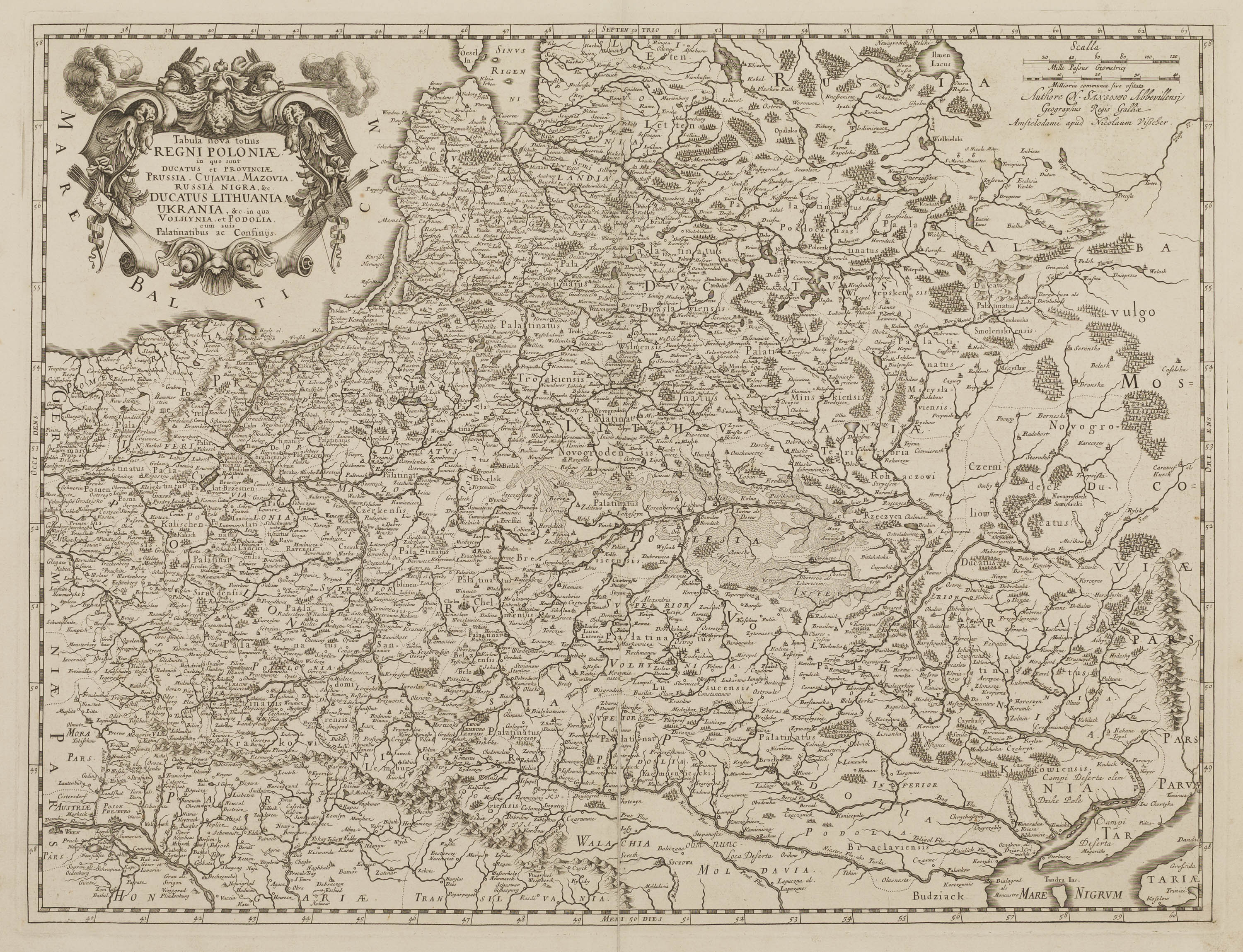 Mapa ziem Rzeczpospolitej, wyd. Nicolaes Visscher II, stan trzeci, Amsterdam ok. 1700 miedzioryt, 43 x 56,5 cm (odcisk płyty) stan zachowania bardzo dobry, niewielkie zabrudzenia w obrębie marginesu Imago Poloniae K22/3