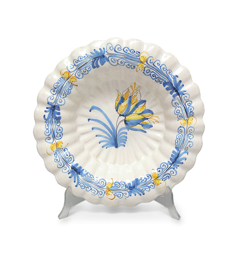 Delft, XVII/XVIII w.fajans, malatury podszkliwne, dekoracja floralna; śred. 30,5 cm; stan zachowania: nieznaczne ubytki szkliwa i masy na krawędzi