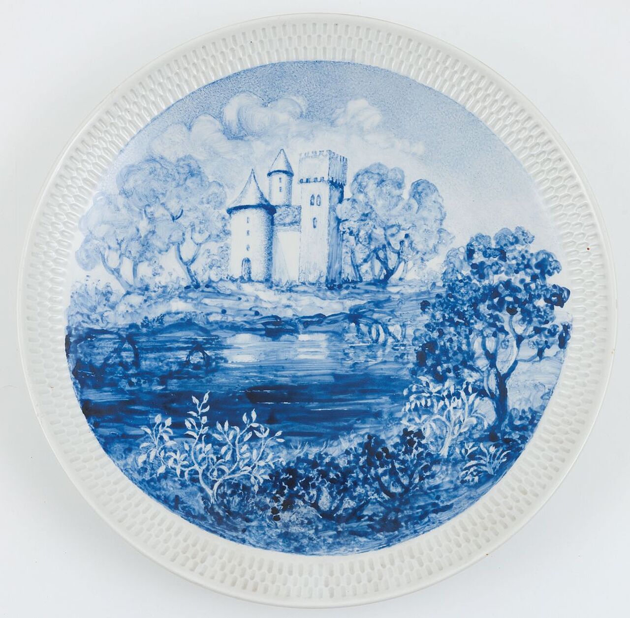 Niebieska farba naszkliwna, porcelana, śr. 32 cm Sygnowany zielonym drukiem C w trójkącie / Chodzież / Made in Poland / 1; czerwonym stemplem: malowała / Zofia Polakow ; Copyright by / Zofia Eggers-Polakow / Warsaw / Al rights reserved