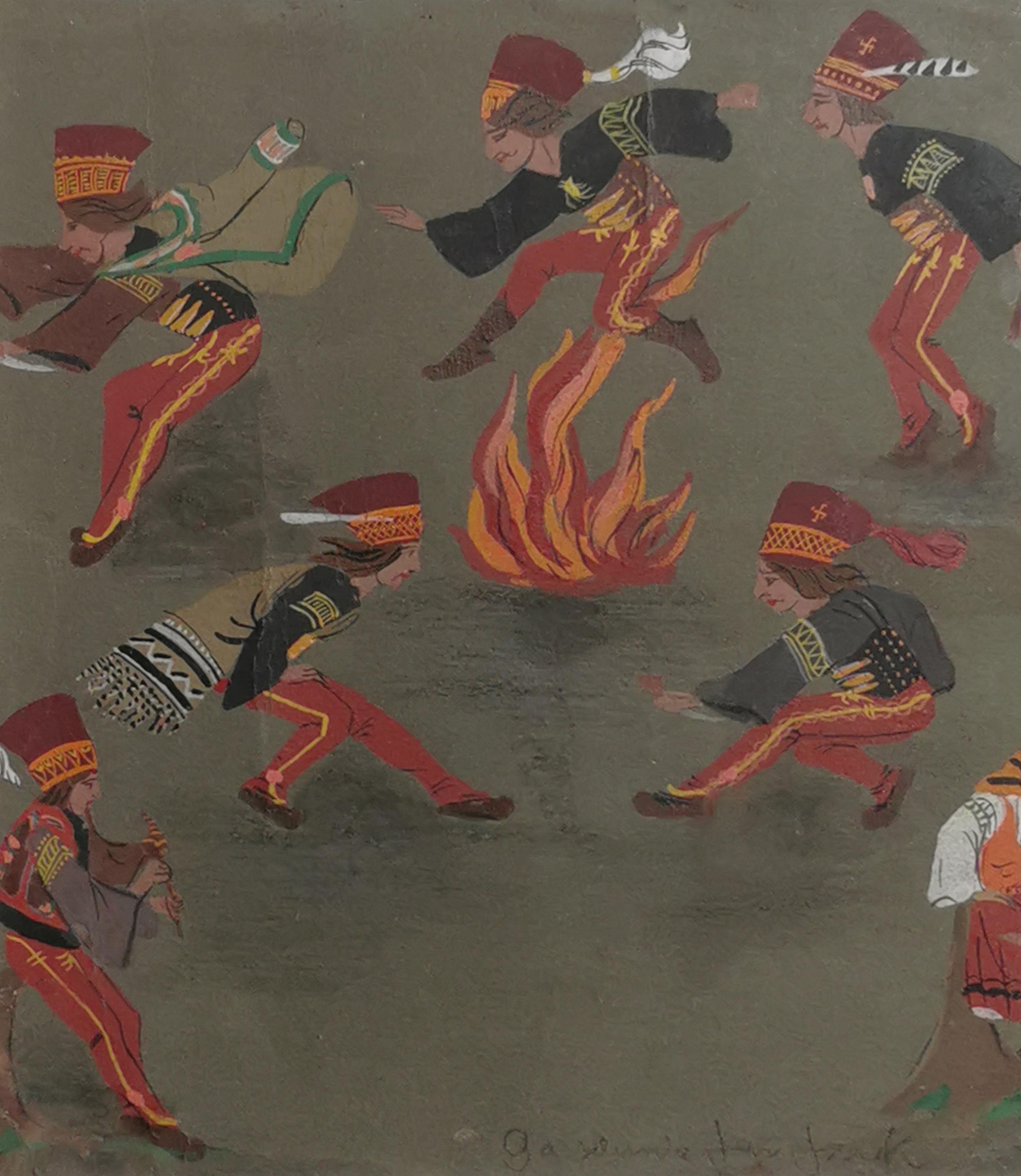 gwasz, grafitowy karton; 23,2 x 20 cm (w świetle oprawy);sygn. p. d.: Gąsienica Jan Szostak (ołówkiem).