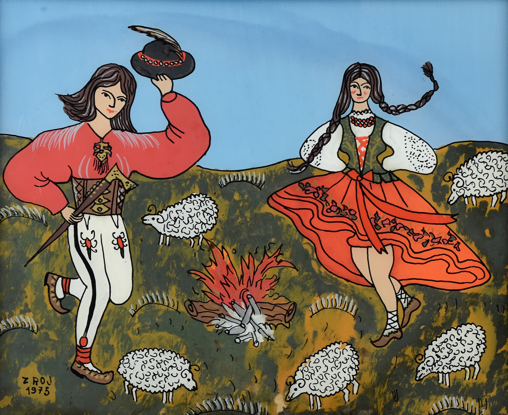 gwasz, szkło, 30,5 x 38 cm; sygn. i dat. l. d.: Z ROJ / 1975; na odwrocie metka: Milenium - SPÓŁDZIELCZE ZRZESZENIE WYTWÓRCÓW PRZEMYSŁU LUDOWEGI I ARTYSTYCZNEGO, przy ul. Floriańskiej 37 w Krakowie