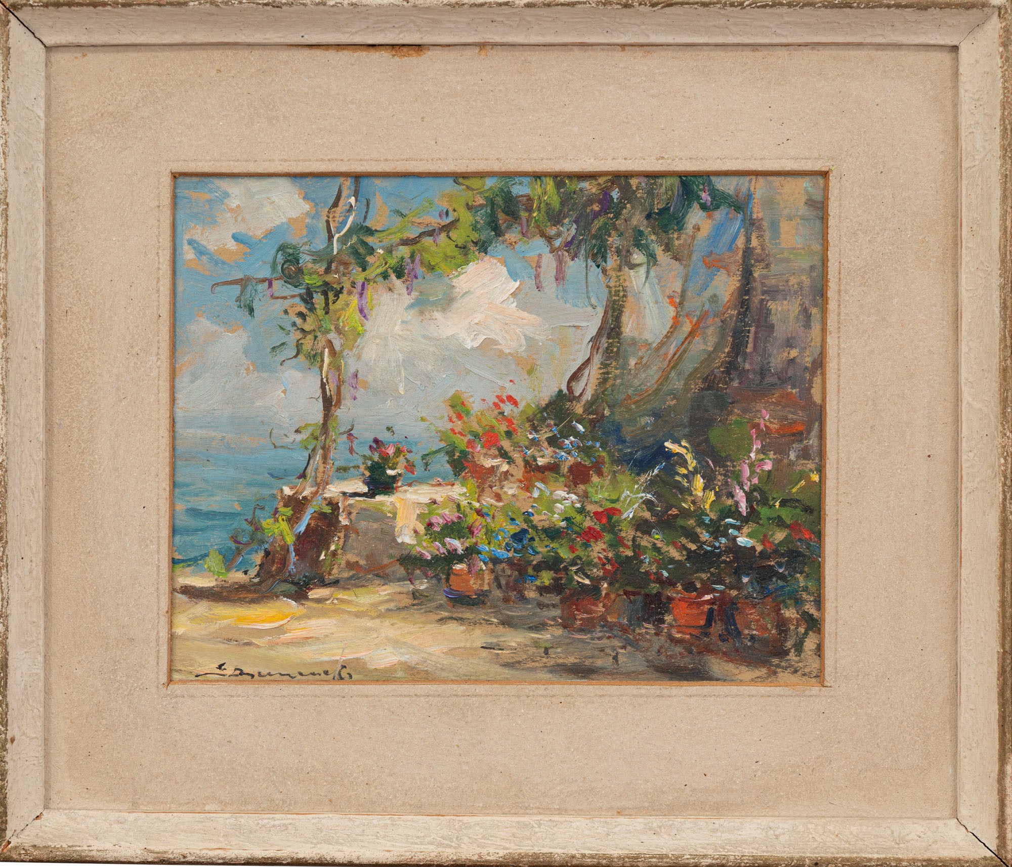 - autorska naklejka z informacjami o obrazie: Tytuł Taras na Capri / technika olejny - cena / rozmiar 20 x 16 - rok 1960