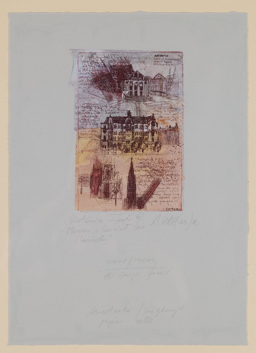 Akwaforta, suchoryt kolorowany; 39 x 28 cm (arkusz) Sygnowany z płyty p.d.: Kasprzak Ołówkiem pod ryciną: Katowice – Teatr Muzeum i Kościół Mariacki 6/100 A. Kasp (-04) / 2001 /2002 / A imp fecit / Akwaforta/ suchoryt papier colle Oprawiony