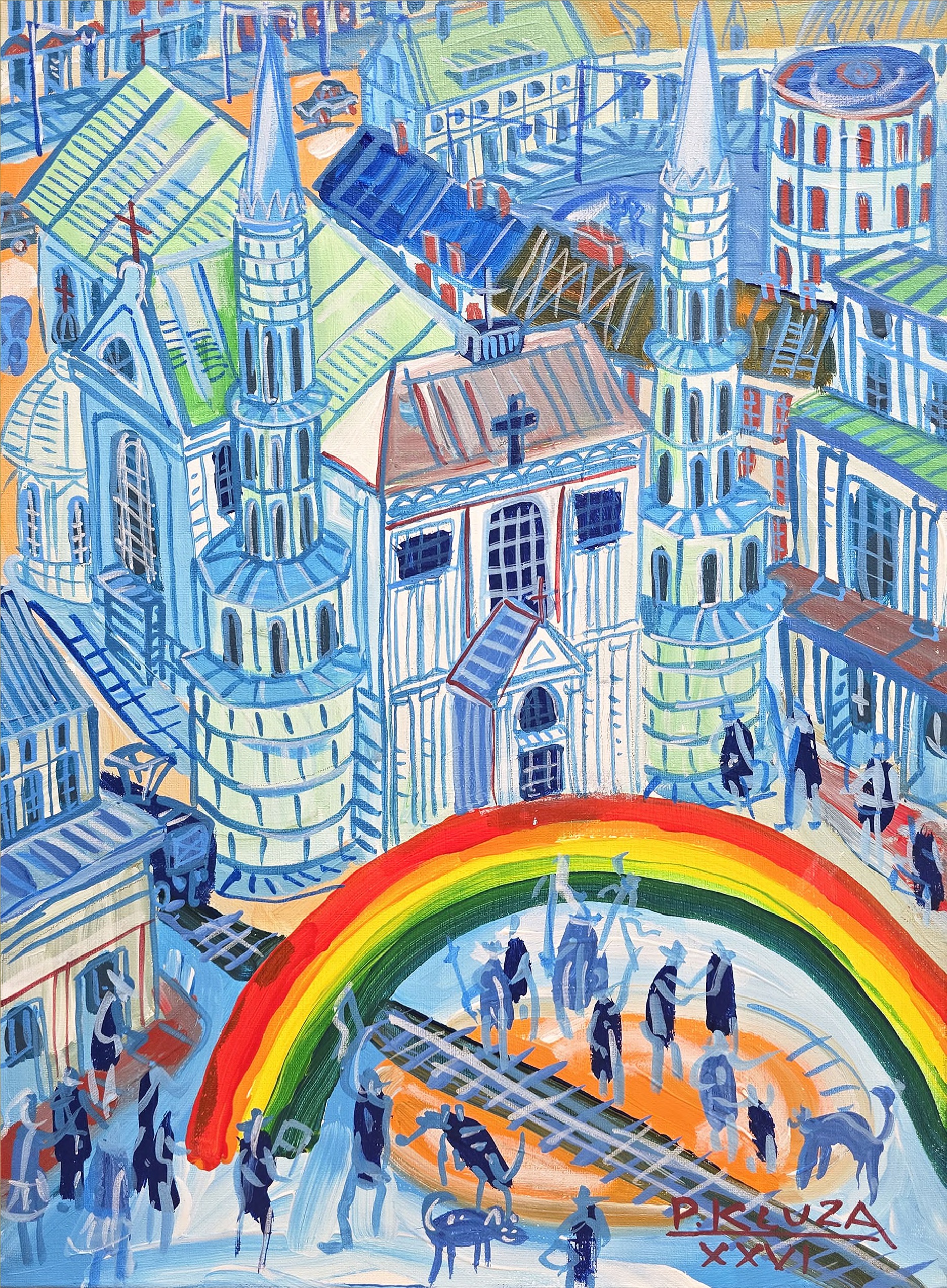 akryl na płótnie, 24 cm x 33 cm; sygnowany z przodu, p.d.: P.KLUZA / XXV; sygnowany, datowany i opisany na odwrocie: P.KLUZA/ ''TĘCZA NA PLACU ZBAWICIELA''/ NR: 4855 / XXVI; dołączony certyfikat autorski