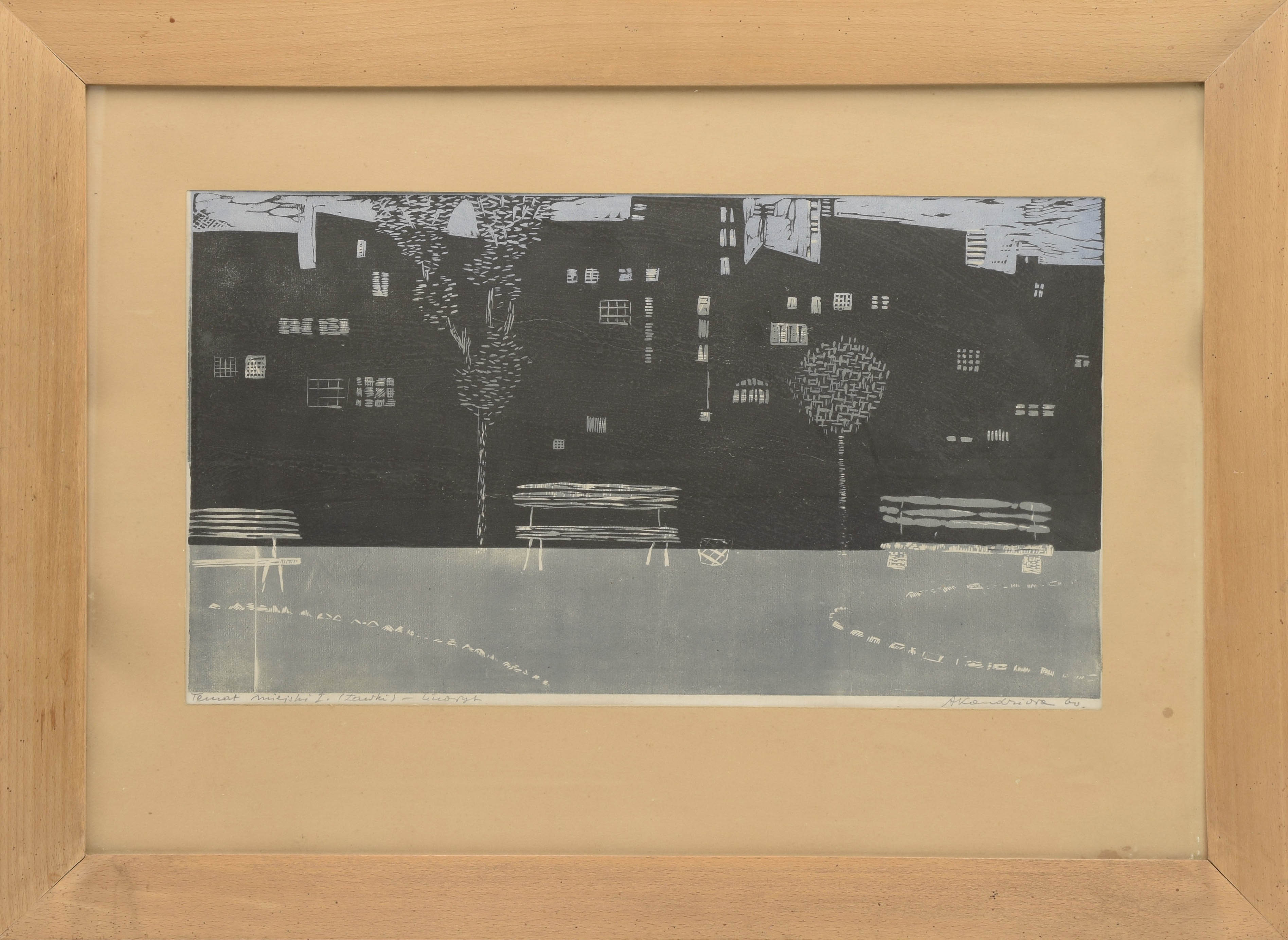 linioryt, papier; 22,5 x 44 cm;sygn. p. d.: AKANDZIORA 60.; l. d.: Temat miejski I. (ławki) - linioryt.