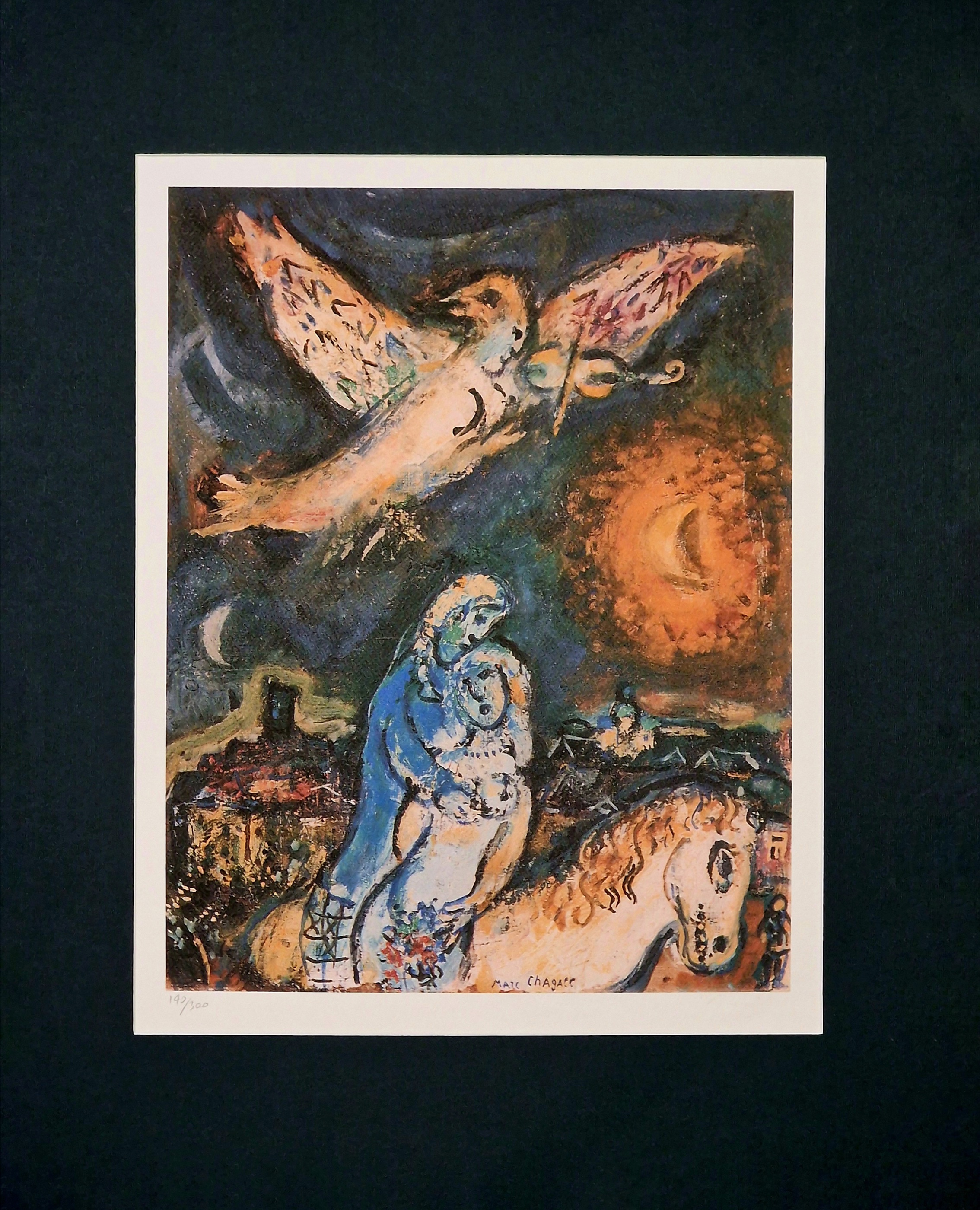 Marc Chagall, znany z wyjątkowego stylu łączącego fantastyczne elementy z realnymi, stworzył wiele obrazów, które wyrażają głębokie emocje związane z jego pochodzeniem, kulturą i duchowością. Jednym z takich dzieł jest obraz „Anioł ze skrzypcami”, znany także jako „Para opuszcza wieś”, Para opuszczająca wieś może symbolizować emigrację, co było częstym tematem w sztuce Chagalla, odzwierciedlając jego własne doświadczenia związane z opuszczaniem rodzinnego Witebska. Może też to być obraz ucieczki przed prześladowaniami, wojną lub po prostu przed codziennymi troskami. W sztuce Chagalla wieś była często synonimem miejsca rodzinnego, pełnego wspomnień, ale także udręk związanych z żydowskim losem.