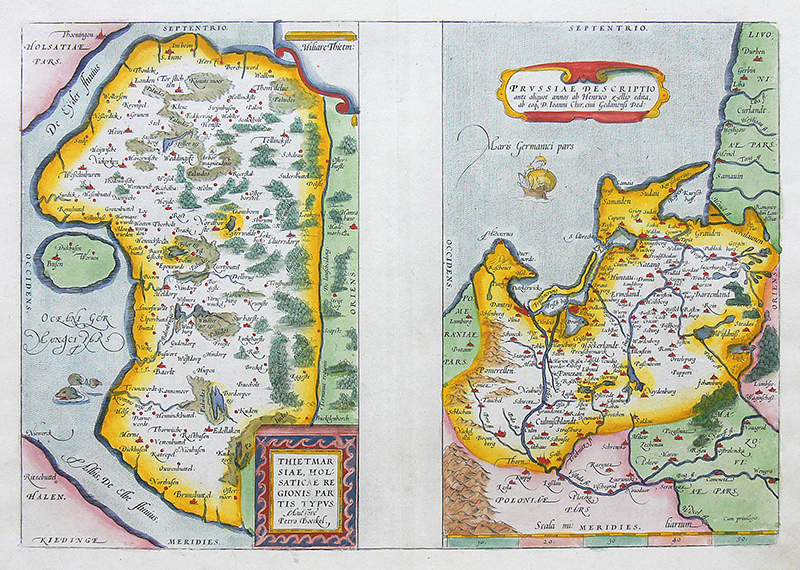 Mapa Szlezwik-Holsztynu oraz Prus, sięgająca na wschód po rzekę Bug, obejmująca okolice Gdańska, Królewca, litewską linię wybrzeża, według Abrahama Orteliusa, Antwerpia 1570 miedzioryt kolorowany, 30,5 x 44 cm
