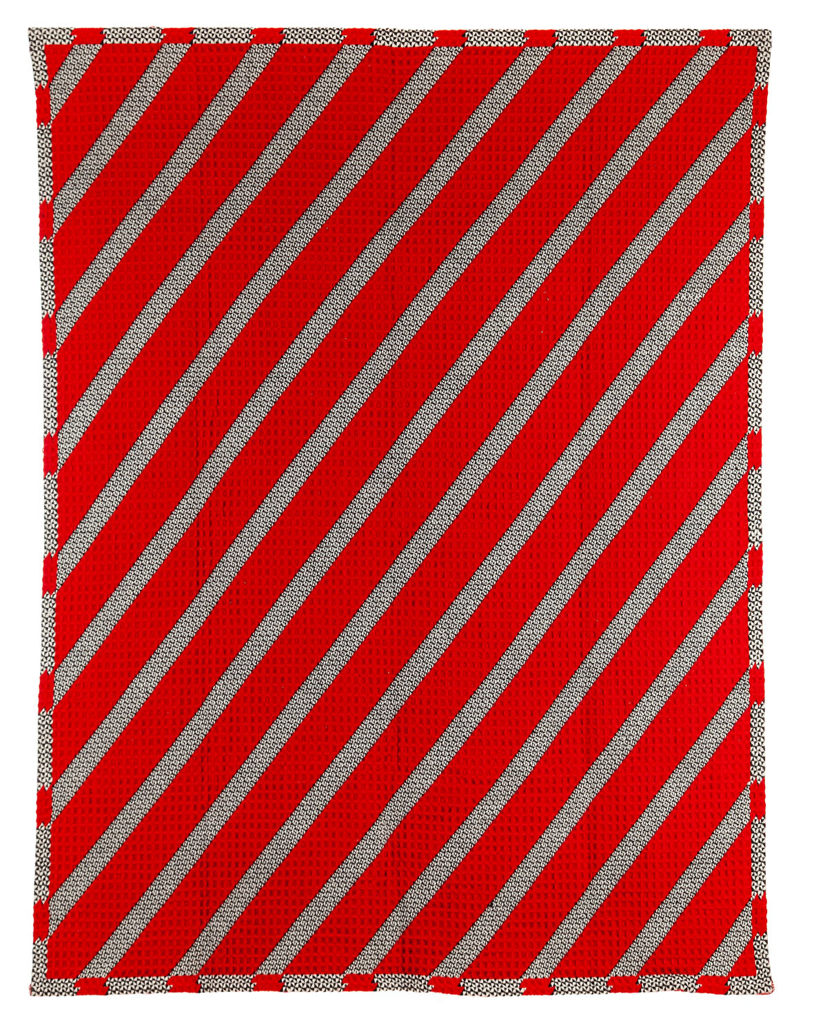 tkanina żarkadowa, 240 x 200 cm na odwrociu autorska naszywka z odręcznym opisem pracy: 'KRYSTYNA NADRATOWSKA | GÓRSKA | 94-115 ŁÓDŹ UL. FALISTA 139 | TKANINA ŻAKARDOWA X | 1988 R WEŁNA | 200 x 240 CM.'