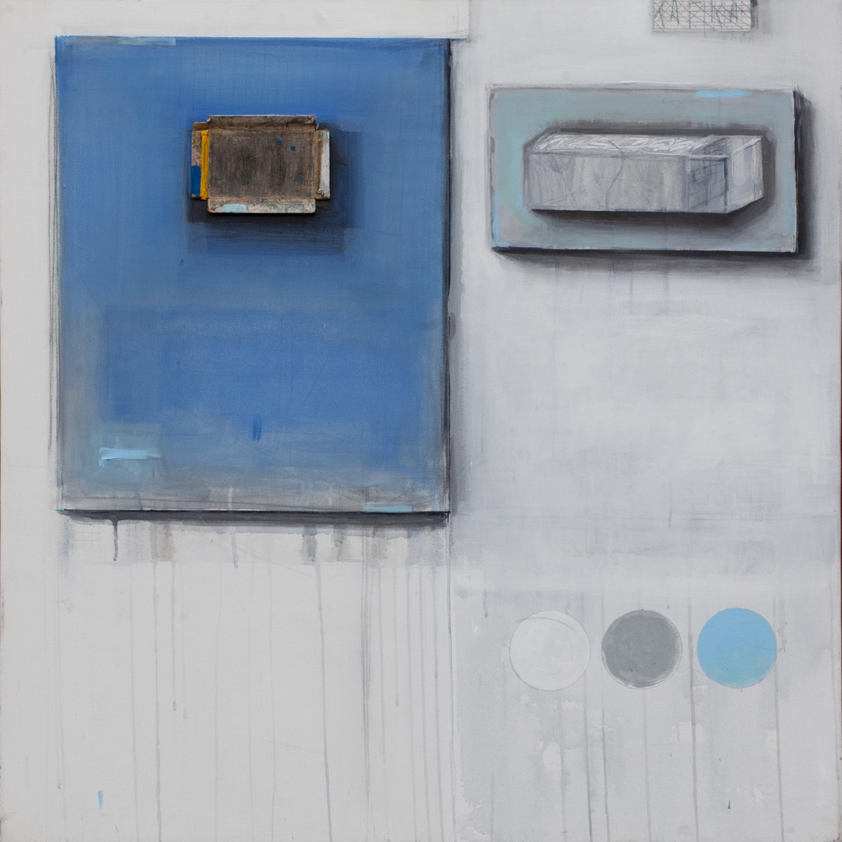 akryl, technika mieszana, płótno, 100 x 100 cmopisany na odwrocie: PIOTR WORONIEC JR. "TRAFO" / zs. MODELE ZASTĘPCZE 1981/2017 W NAWIĄZANIU DO AFORYZMU F. KAFKI NR. 55