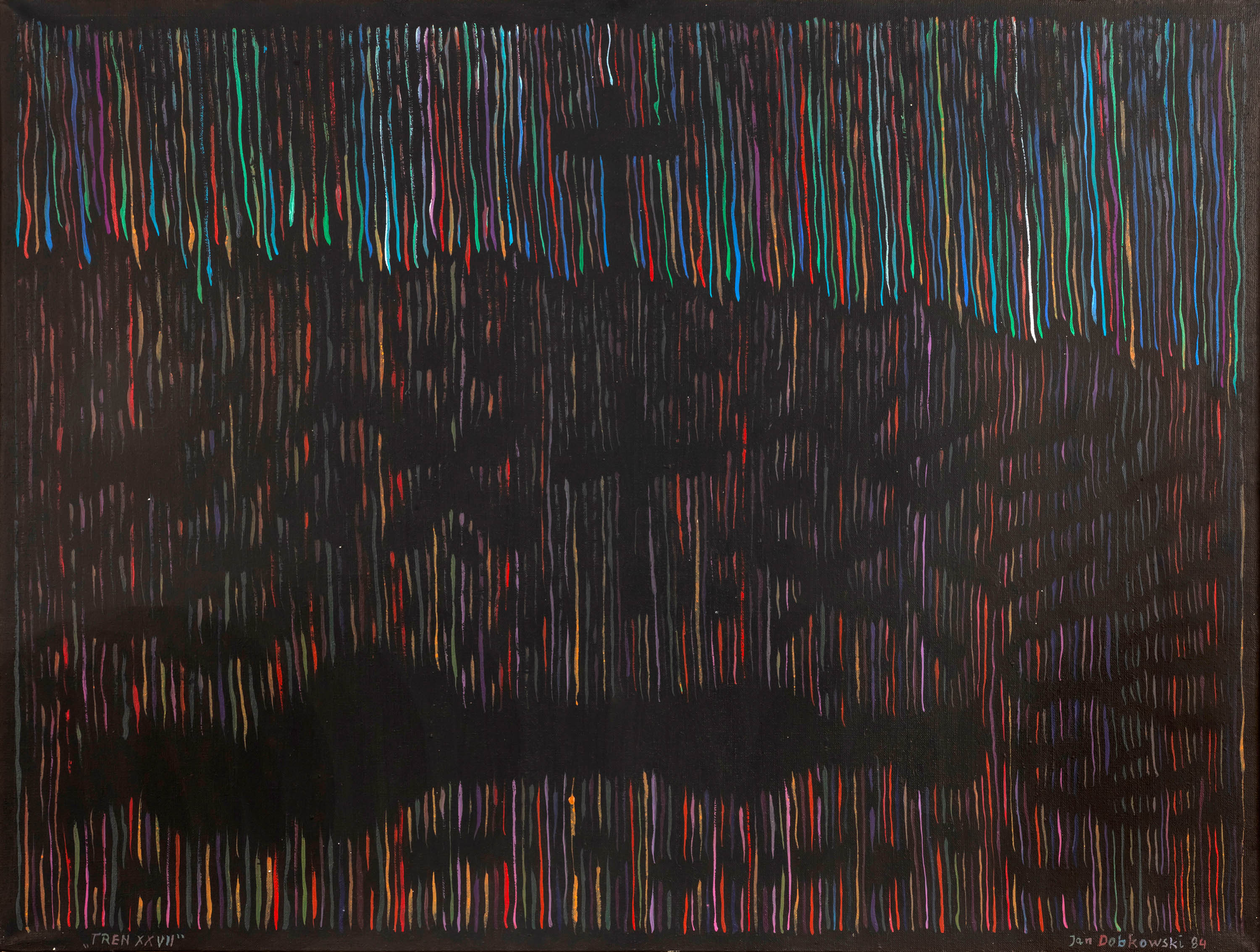 olej, akryl, płótno, 60 x 80 cm, sygn. i dat. p.d.: Jan Dobkowski 84, opisany l.d.: "TREN XXVII", na odwrocie sygn., opisany i dat.: Jan Dobkowski / "TREN XXVII" 1984 / olej+akryl 60 cm x 80 cm