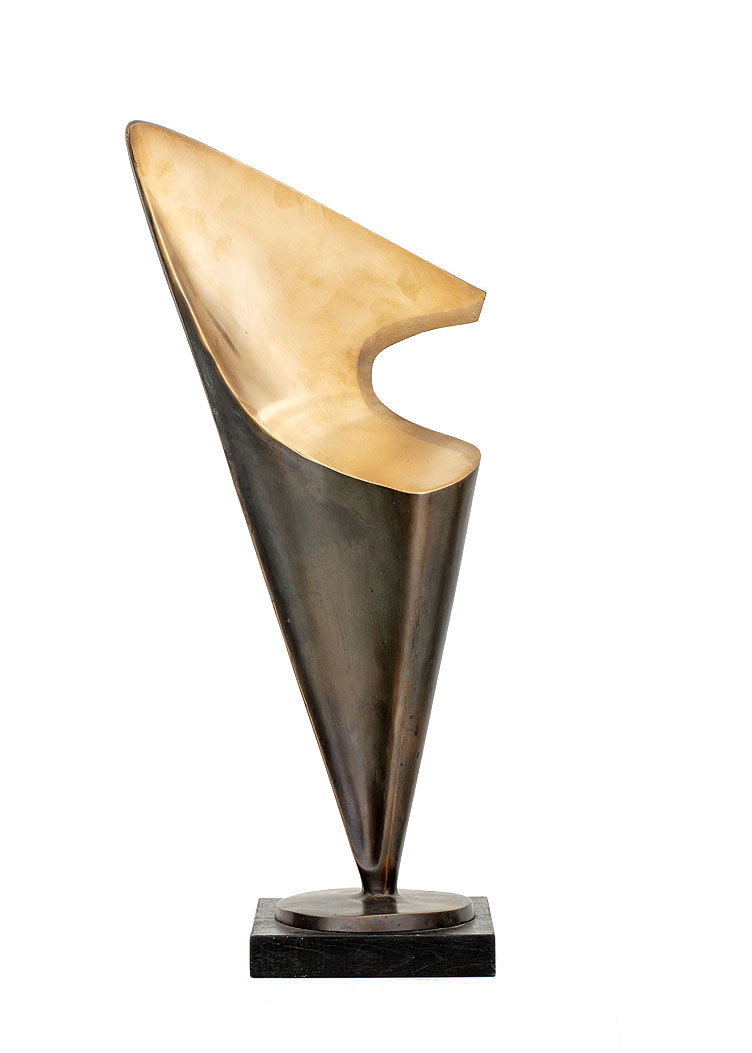 „Trójkątna” została odlana w brązie przez artystę za jego życia, w pojedynczym egzemplarzu, co czyni ją dziełem unikatowym i kolekcjonersko wyjątkowym. Smukła, strzelista, zbudowana z wyważonych proporcji, rzeźba zachowuje organiczny puls mimo całkowitej geometryzacji. Gładka, polerowana powierzchnia kontrastuje z patynowanymi partiami metalu, podkreślając napięcie między formą a światłem. Łodziana osiąga tu rzadką w rzeźbie równowagę między awangardową syntezą a klasycznym poczuciem piękna – tworząc czystą i poetycką opowieść o kobiecości.