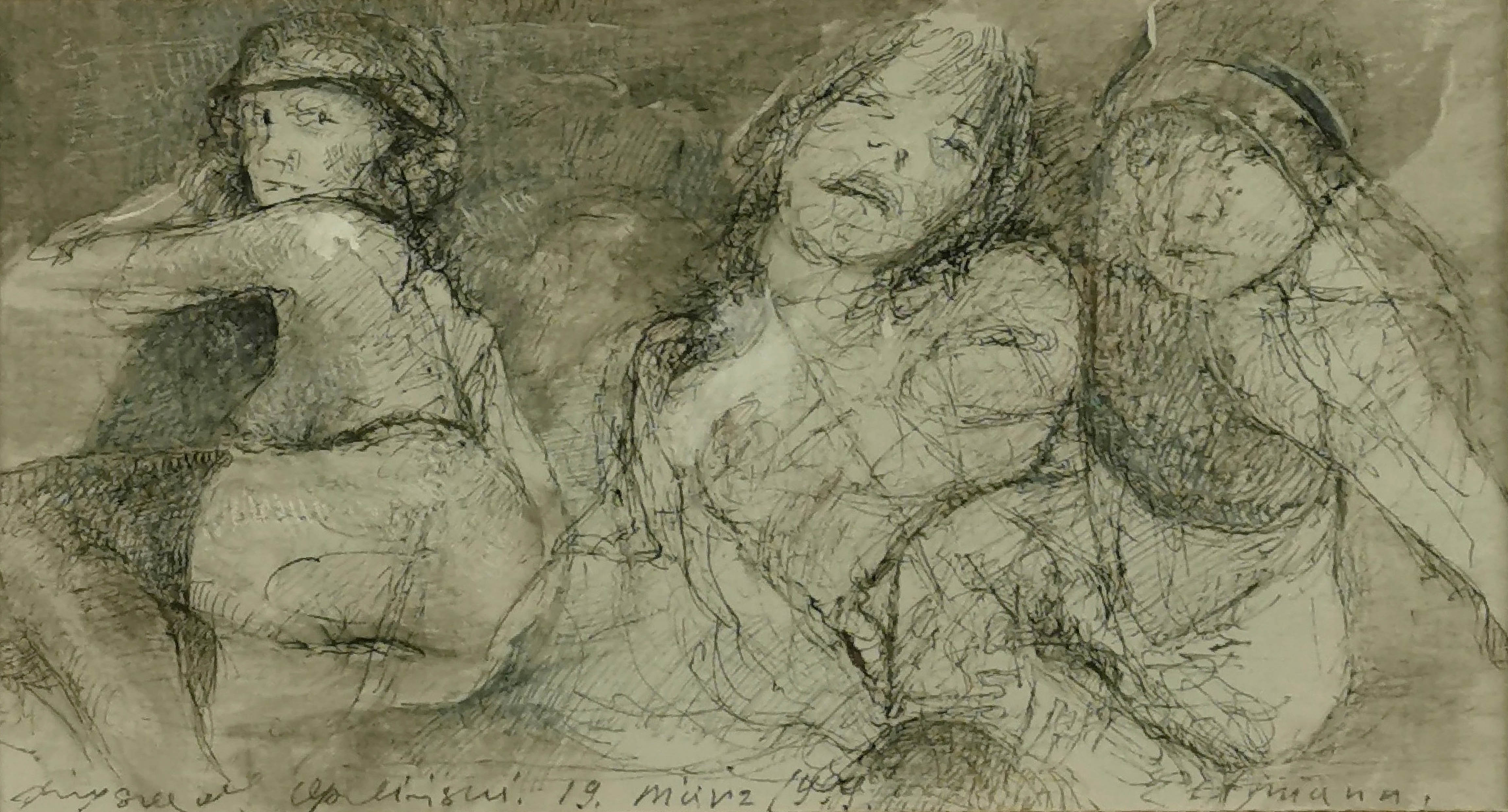 tusz, ołówek, papier; 9 x 15 cm (w świetle passe-partout); sygn., dat. i opisany u dołu: Ryszard Opaliński 19.marz 1999. Eltmann; na odwrocie naklejka z opisem: RYSZARD OPALIŃSKI / 19. MARZ 1999 - ELTMANN / TUSZ / WYMIARY - 14,9 X 19,2 cm.