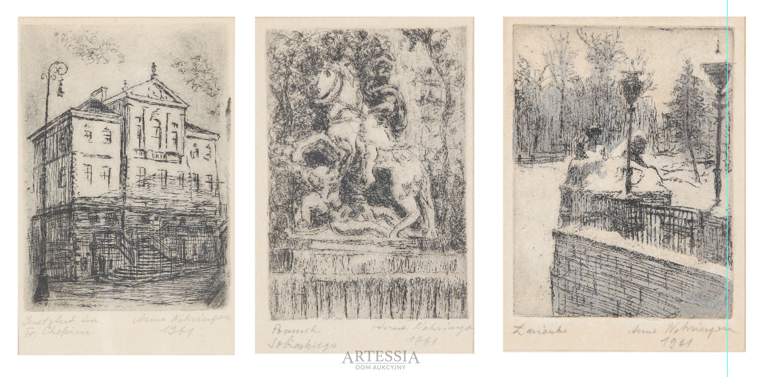 Trzy grafiki o tematyce warszawskiej: Instytut im. Fr. Chopina, Pomnik Sobieskiego, Łazienki, 1961