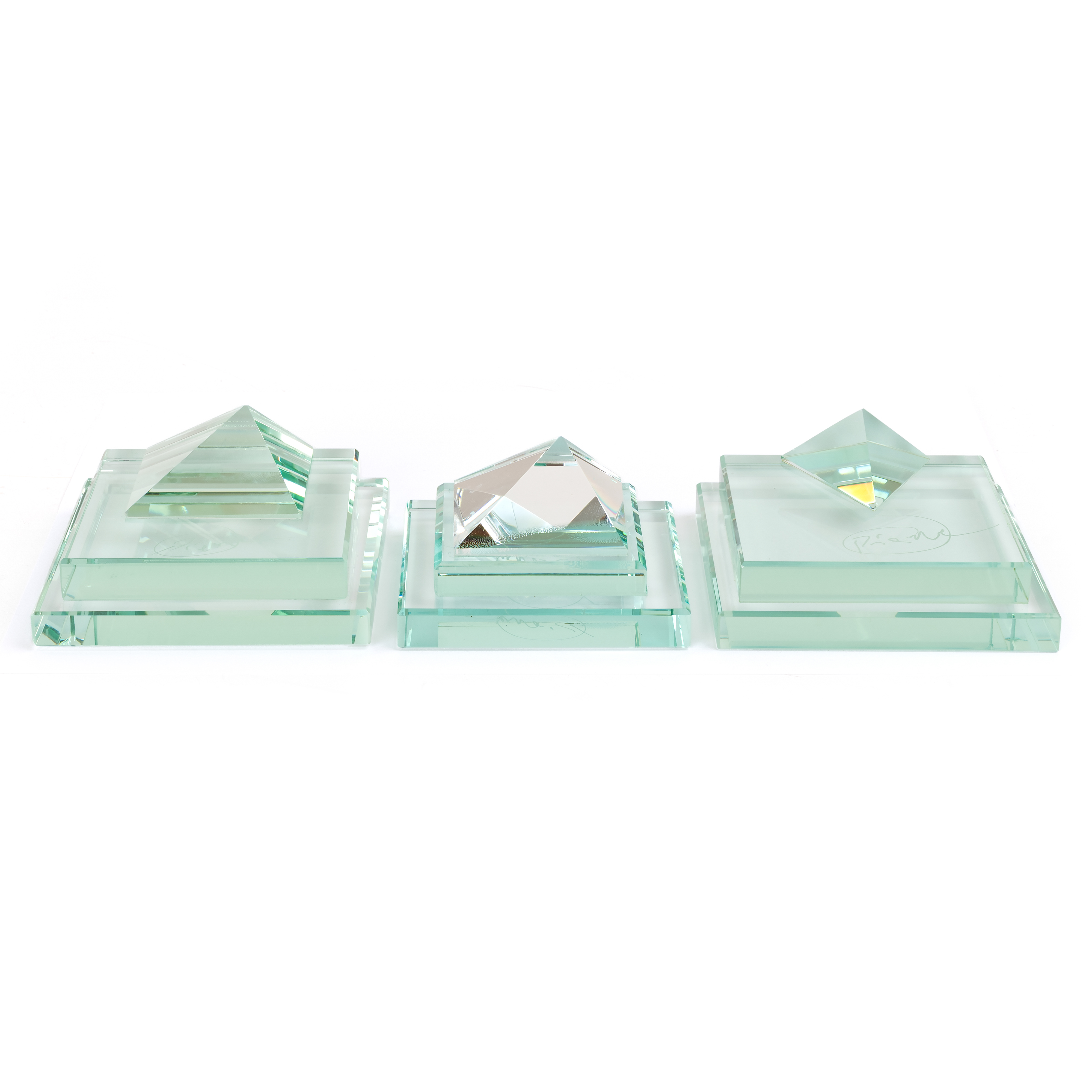 szkło float/pryzmat optyczny; o wymiarach 7,8 x 8 x 4 cm; 9 x 9 x 4 cm; 9 x 9,5 x 4 cm, każdy z wyrytą sygnaturą