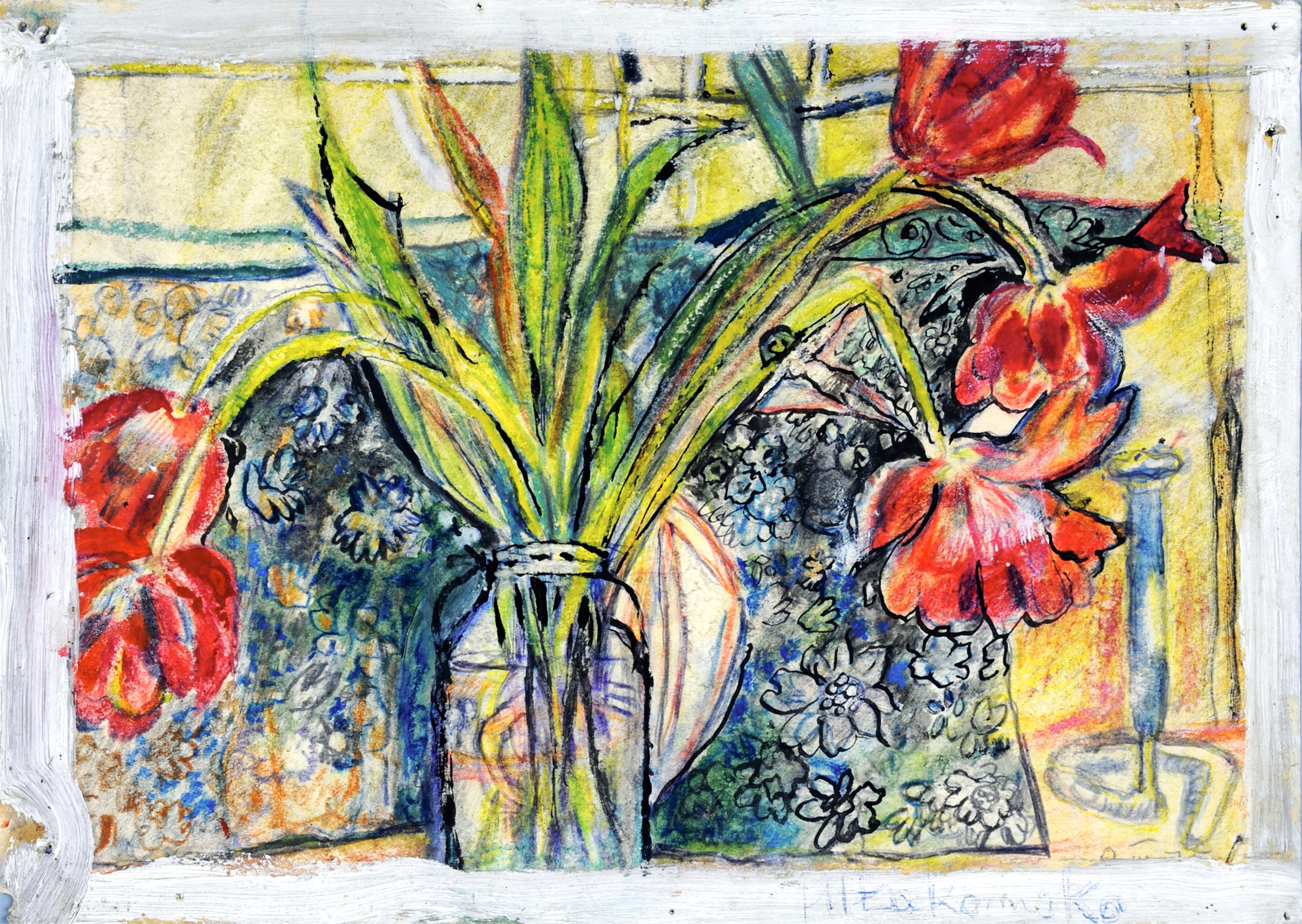 datowanie autorskie u dołu z prawej: 8 III 75 (częściowo zamalowana białą farbą); sygnowana u dołu z prawej: JM Łakomska (długopisem, na białym autorskim obramieniu)