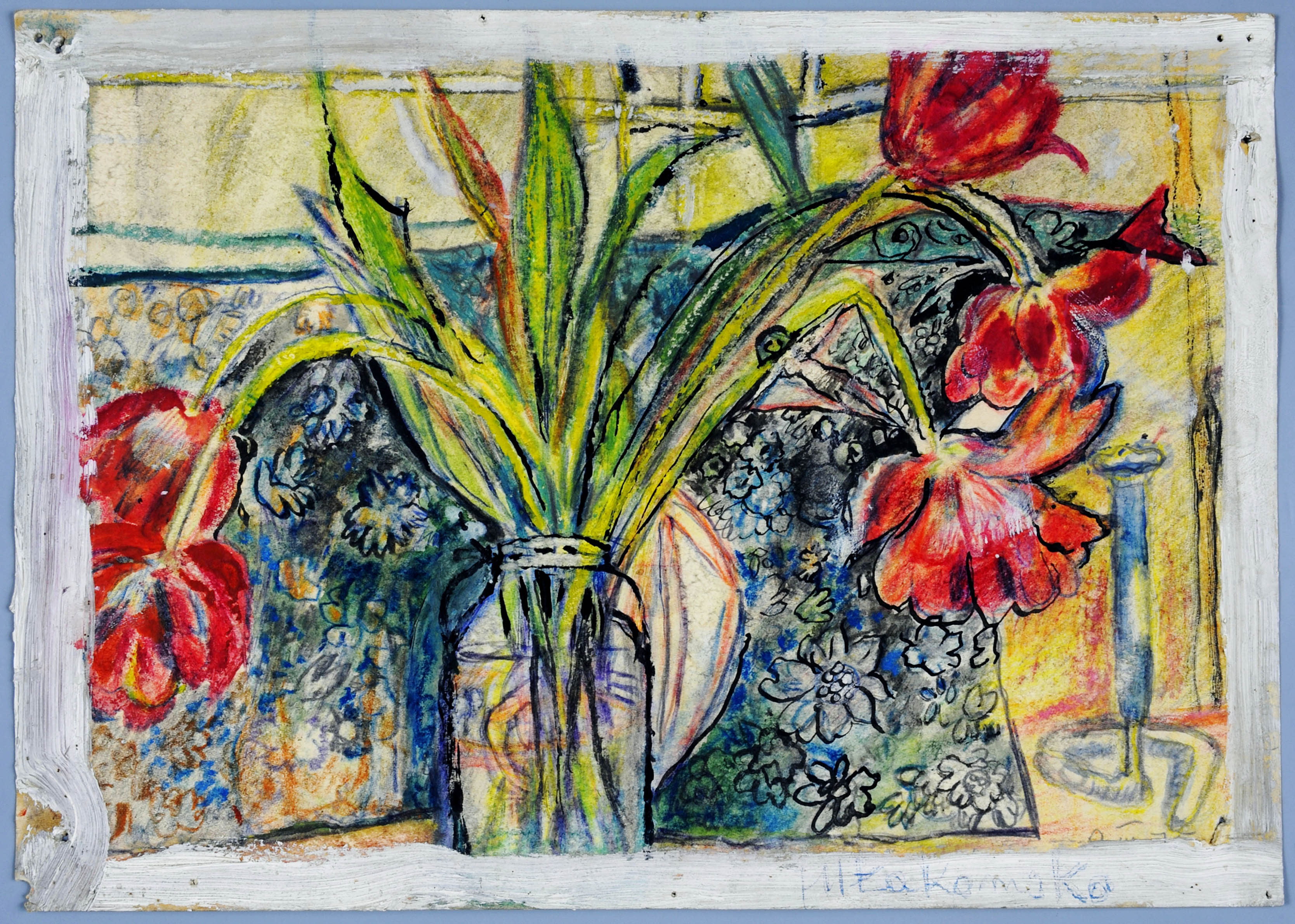 datowanie autorskie u dołu z prawej: 8 III 75 (częściowo zamalowana białą farbą); sygnowana u dołu z prawej: JM Łakomska (długopisem, na białym autorskim obramieniu)