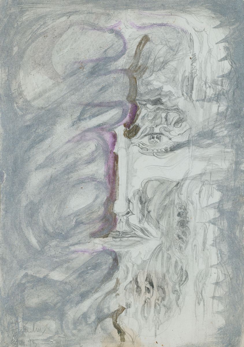 Ołówek, akwarela, srebrna farba; 35 x 24,5 cm