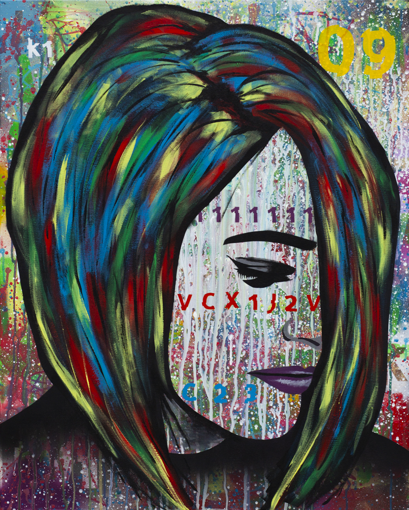 technika mieszana, płótno, 100 x 80 cmopisany na odwrocie: 2018 "TYPOGIRL 09" ARTUR "KOCUR1" MARCINISZYN