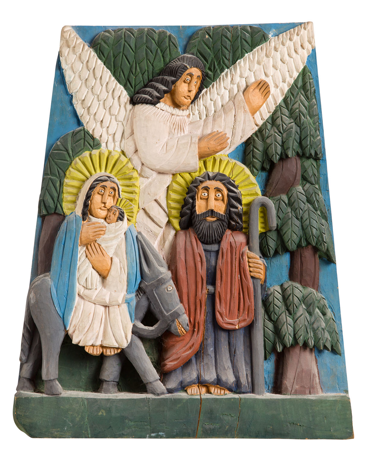 drewno polichromowane, 50 x 40 cm sygnowany, datowany i opisany na odwrociu: 'Ucieczka do Egiptu. Chojęta Bronisław. 21-412 Adamów | Woj. Siedlec. Rzeźbę wykonałem, 4. III 1981 roku.'