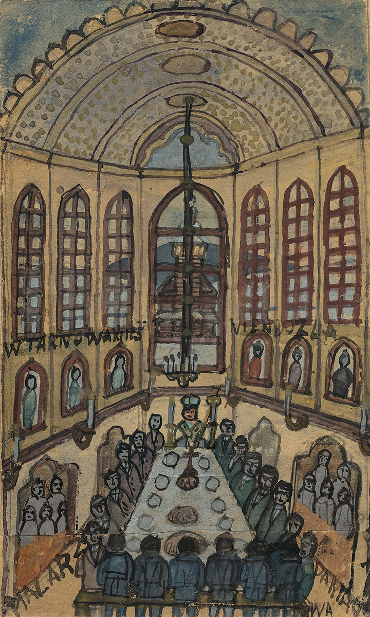 akwarela, gwasz, papier25,7 x 15,3 cmopisany w kompozycji: WTARNOWANIES NIENDDZWA / MALARZ / PANIA / WA