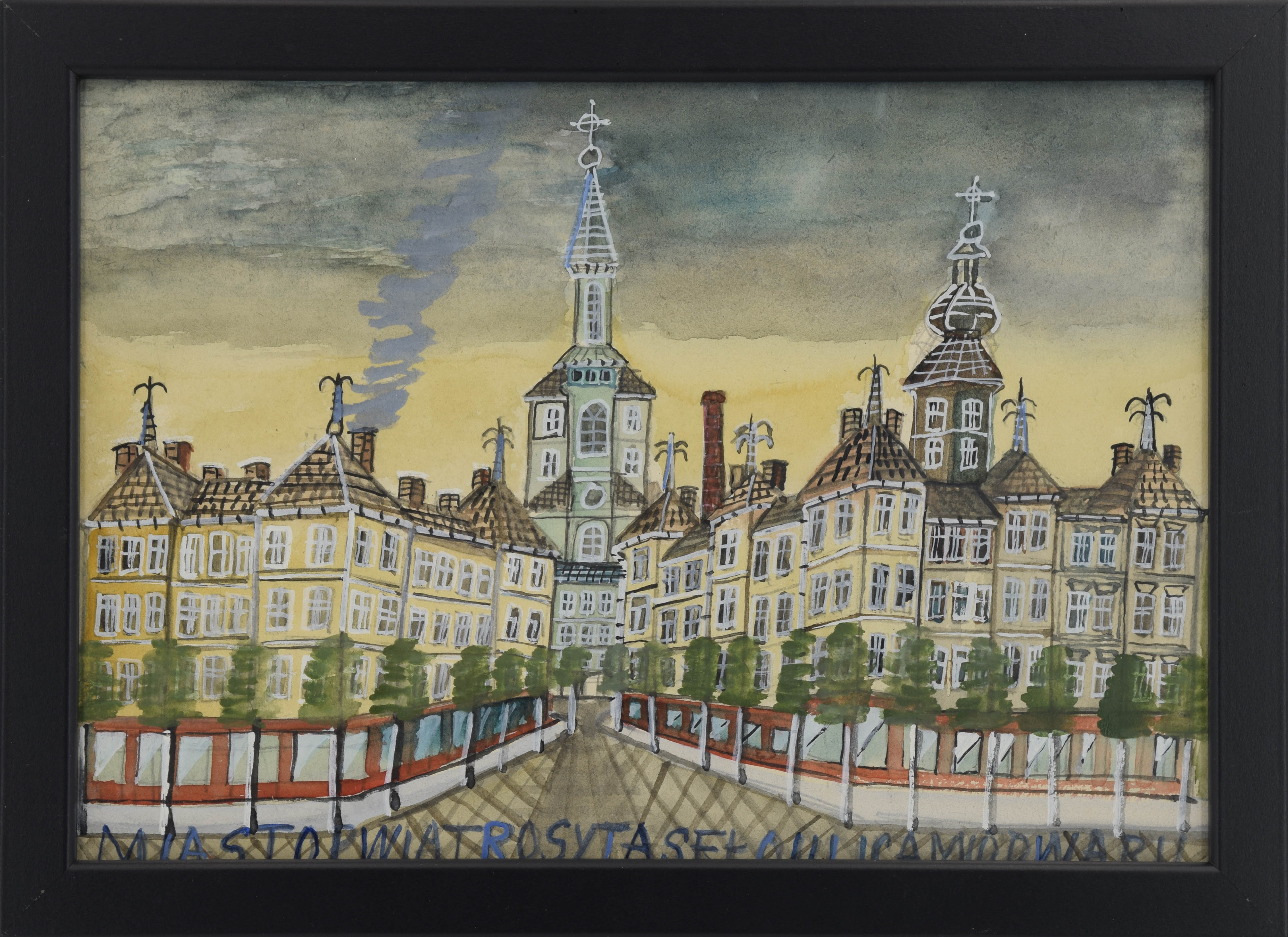akwarela na podrysowaniu ołówkiem, papier; 21 x 30 cm;u dołu napis: MIASTOPWIATROSYTASEŁOULICAMIODWARU;na odwrocie okrągła pieczęć z portretem w środku, w otoku napis: PAMIĄTKA Z KRYNICY / NIKIFOR ARTYSTA MALARZ oraz napis: 100 zł (ołówkiem).